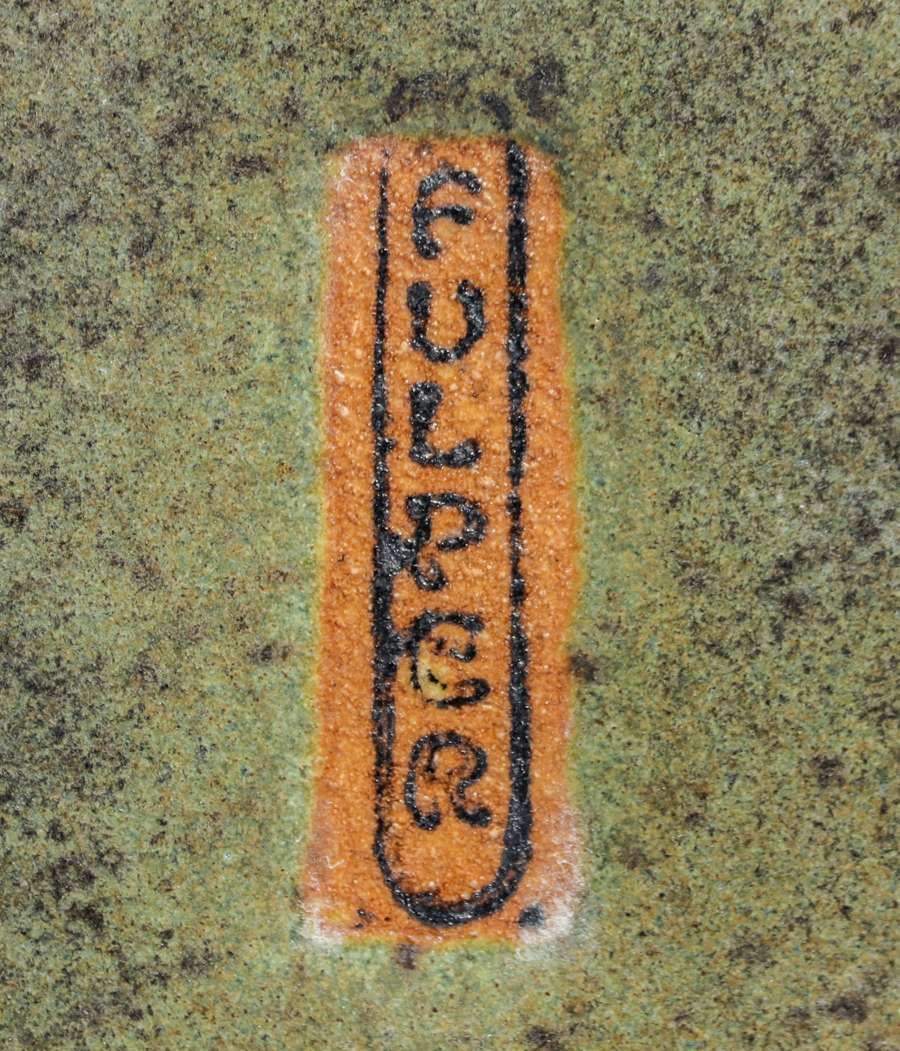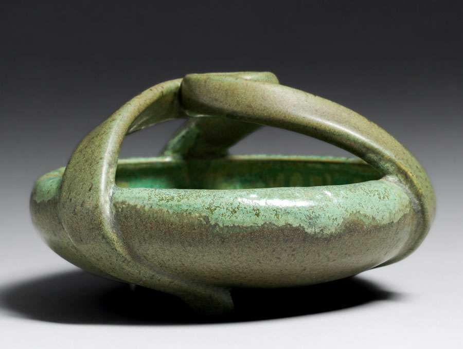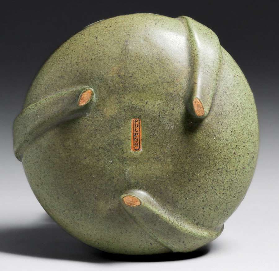 Rare Fulper Swirled Centerpiece Bowl c1910s. This forms rarely surfaces. Not sure how many where made, but one can assume that not many of this form survived. Invisible professional restoration to small grinding chips to feet, otherwise perfect condition. 8.5″d x 4.75″h SOLD