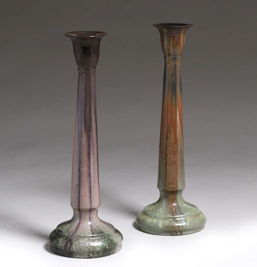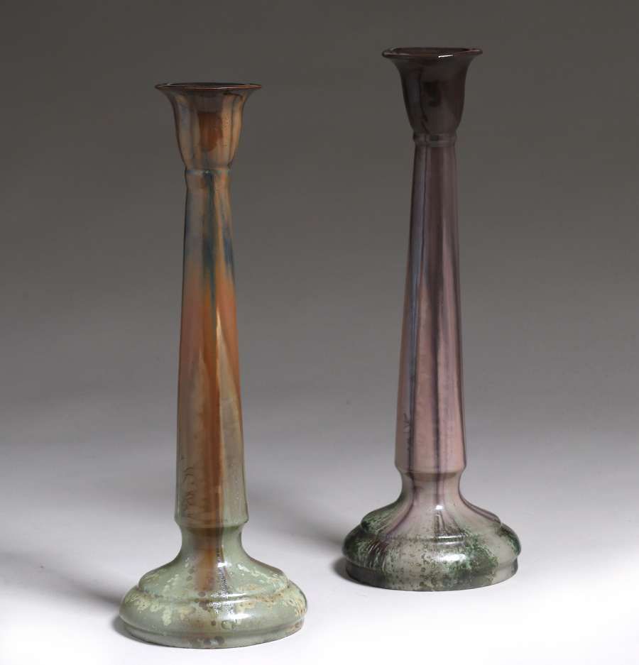 Tall Fulper Pottery candlesticks with an Elephant's Breath flambe over an incredible cucumber-leopard's skin glaze. Signed. Tight hairlines in base of each and invisible, professional restoration to rim chip and slight unevenness to rims. 15.5"h x 5.25"d SOLD