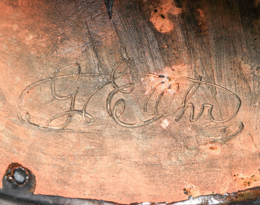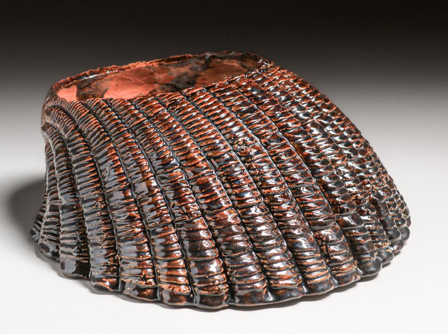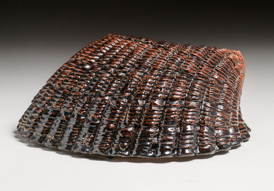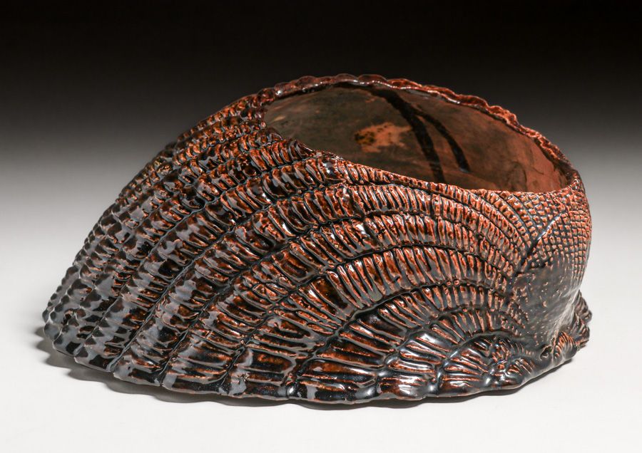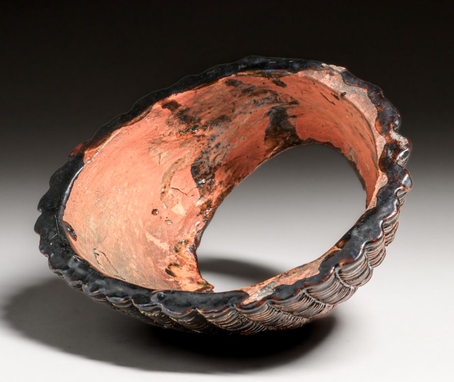 Large George Ohr Pottery Inkwell Shell c1900. Signed. Invisible professional restoration to kiln kiss, otherwise perfect condition. Approximately 11"d x 4.5"h SOLD