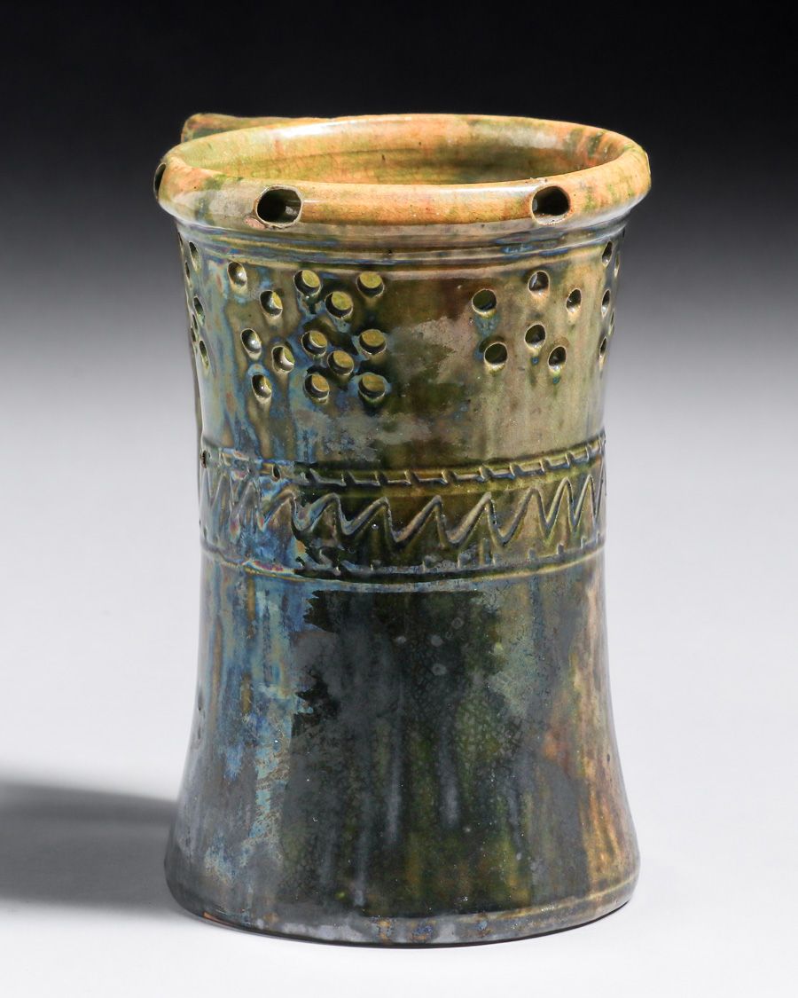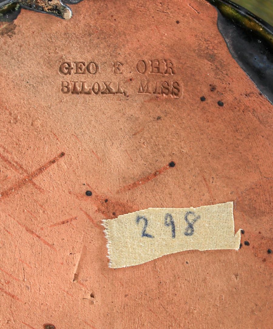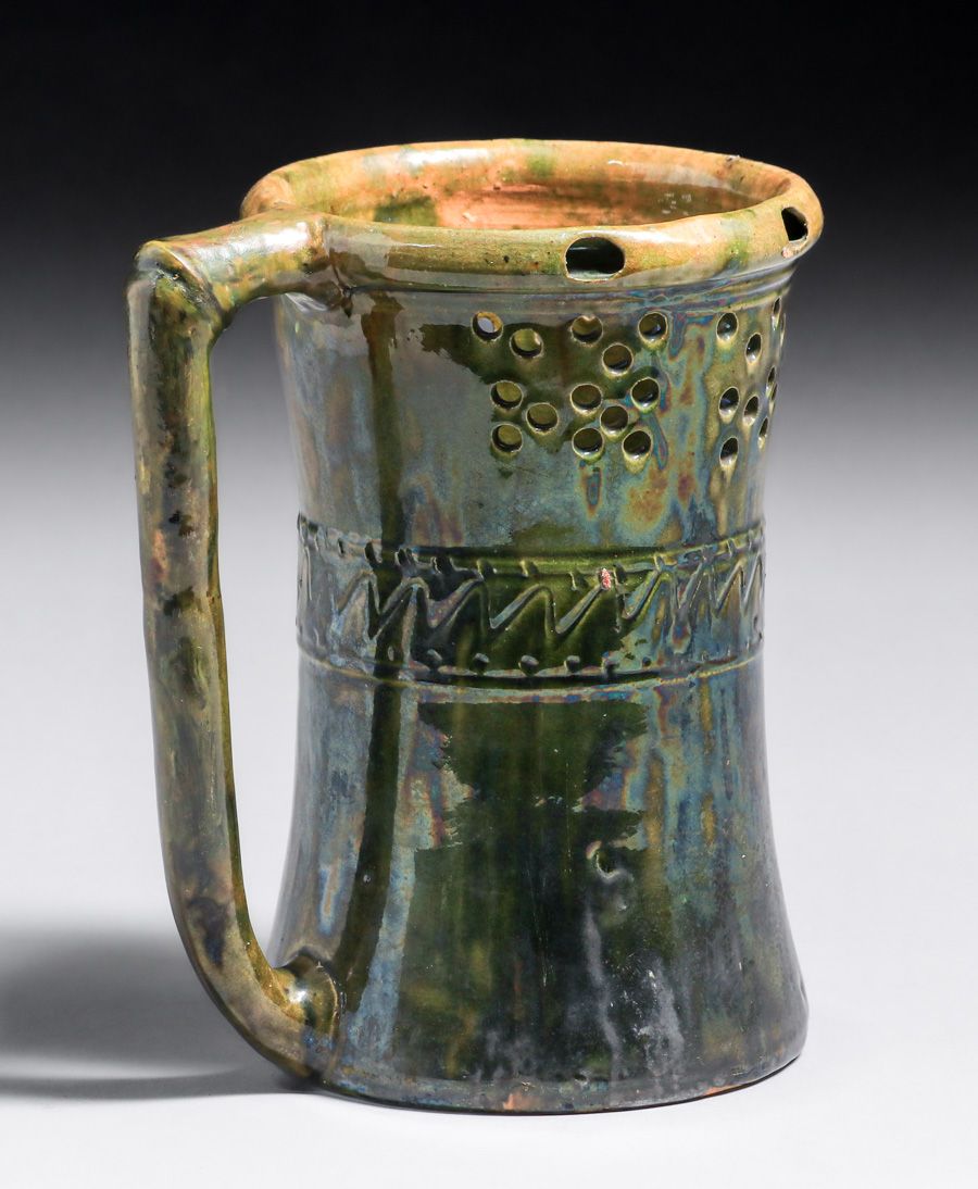 Large George Ohr Puzzle Mug c1890s. This mug is much, much bigger than the normal George Ohr Puzzle Mug. Signed. Invisible professional restoration to handle, otherwise perfect condition. 7.5"h x 6.5"w x 5.5"d SOLD