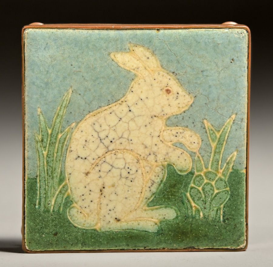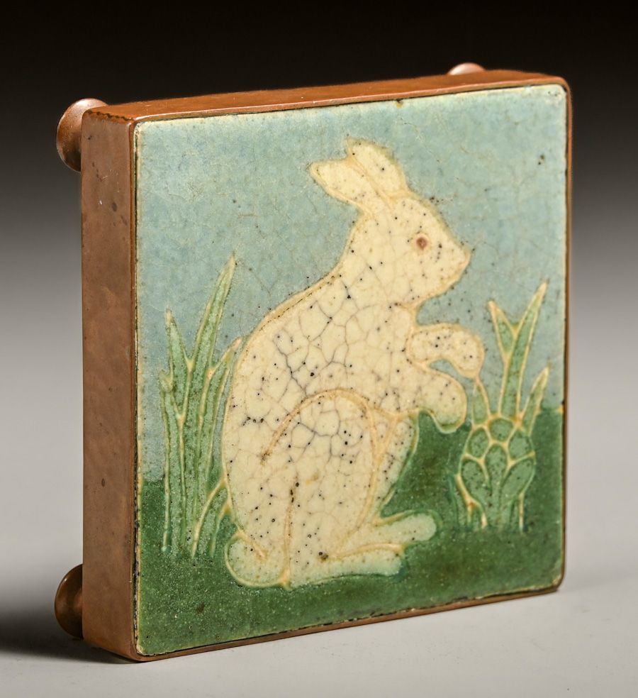 - Grueby - Boston Handicraft Shop Hammered Copper Framed Trivet Tile c1905
