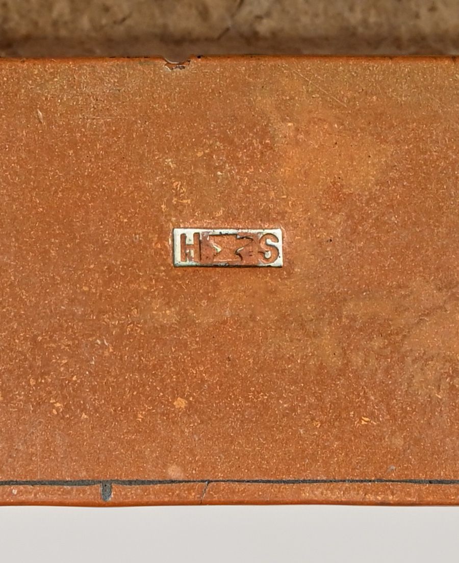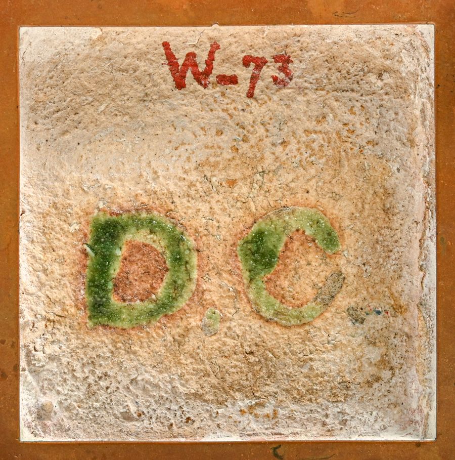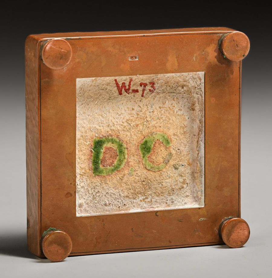 Grueby - Boston Handicraft Shop Hammered Copper Framed Trivet Tile c1905. Grueby artist signed "DC" and signed with Boston Handicraft Shop "HS" and anvil mark. Excellent original patina. Tight line to corner. 4" x 4" x 1"h $3500