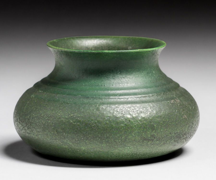 Grueby Pottery Dark Matte Green Vase c1910. Signed. Invisible professional restoration to small rim chip, otherwise perfect condition. 5.25"d x 3"h SOLD