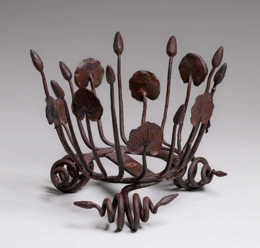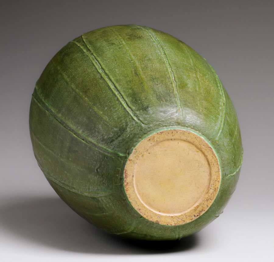 Grueby Pottery Matte Green Vase c1905. Period hand-forged iron stand. Unsigned. Invisible professional restoration to drill hole otherwise perfect condition. Grueby vase 16"h x 9"d. 18.5"h overall SOLD