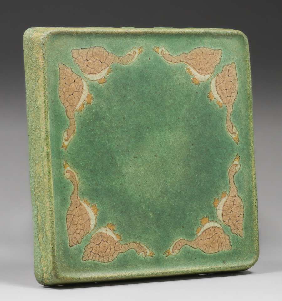 Large Grueby Goose Trivet Tile c1905. Exquisite example of Grueby's "cloisonne" decoration with fine detail and perfectly controlled colors. Artist signed "MCM", otherwise unsigned. Invisible professional restoration to two small base chips and one to the raised edge, otherwise perfect condition. 9.5" x 9.5" x 1 1/8"h SOLD