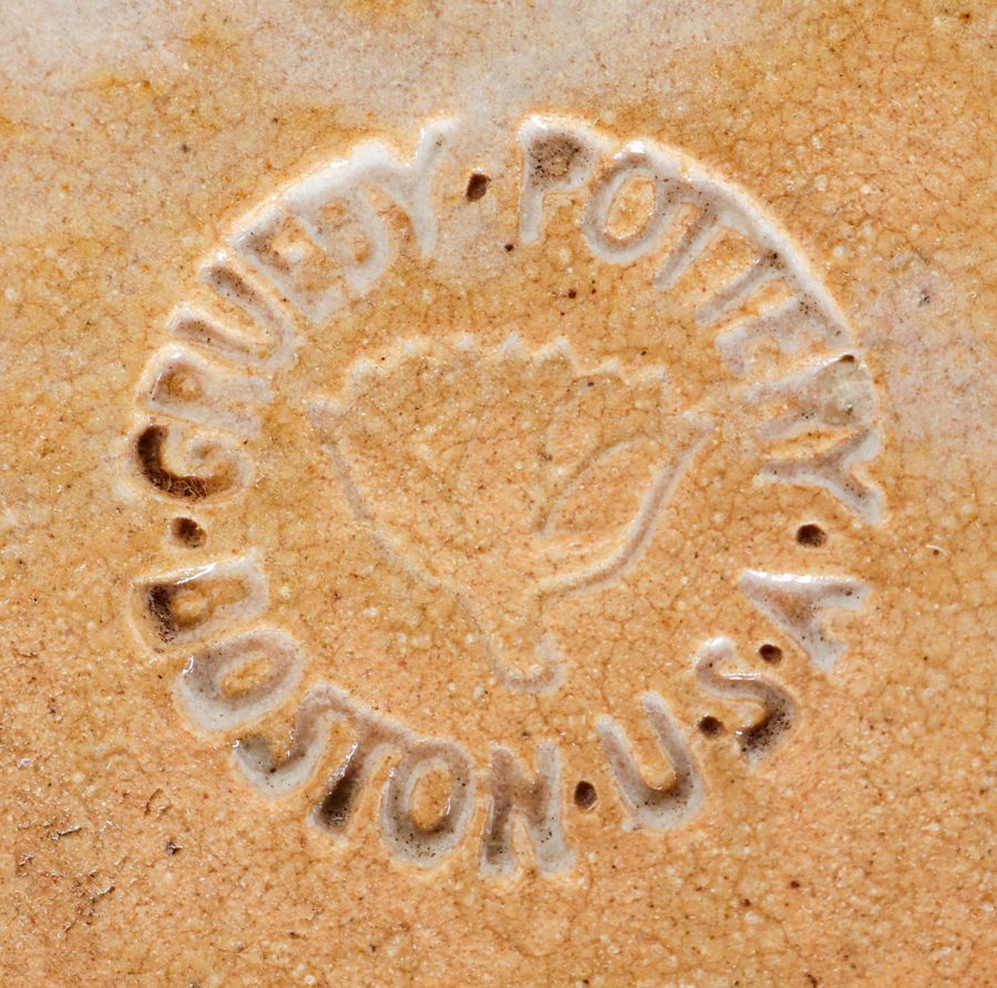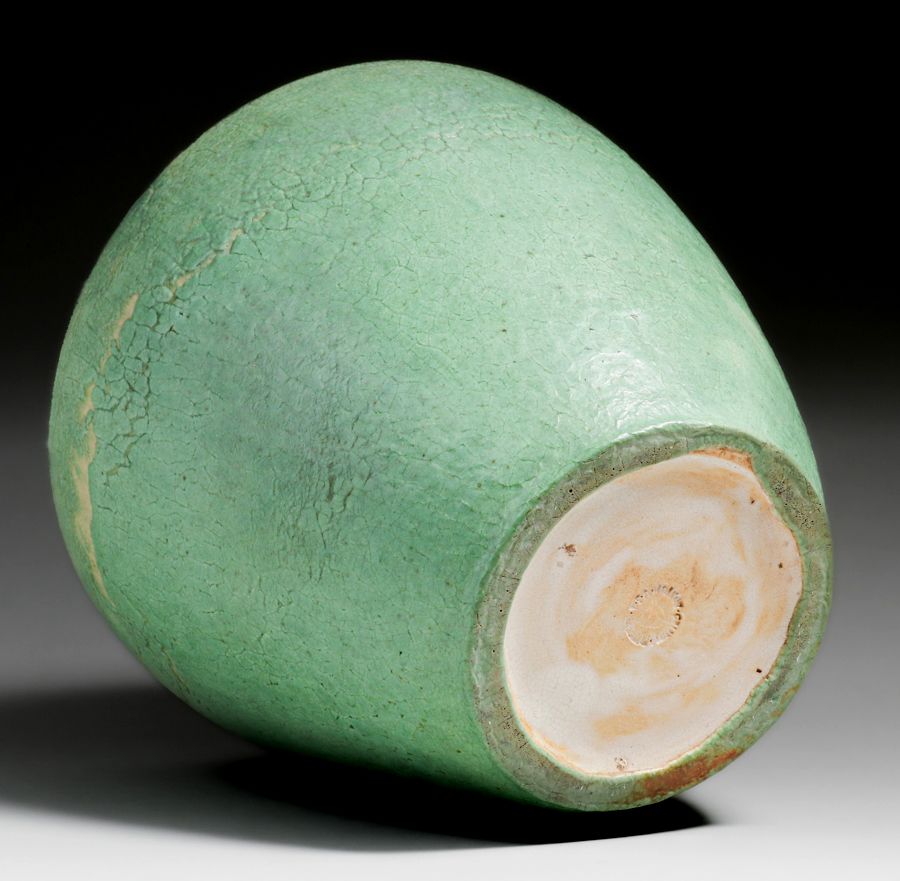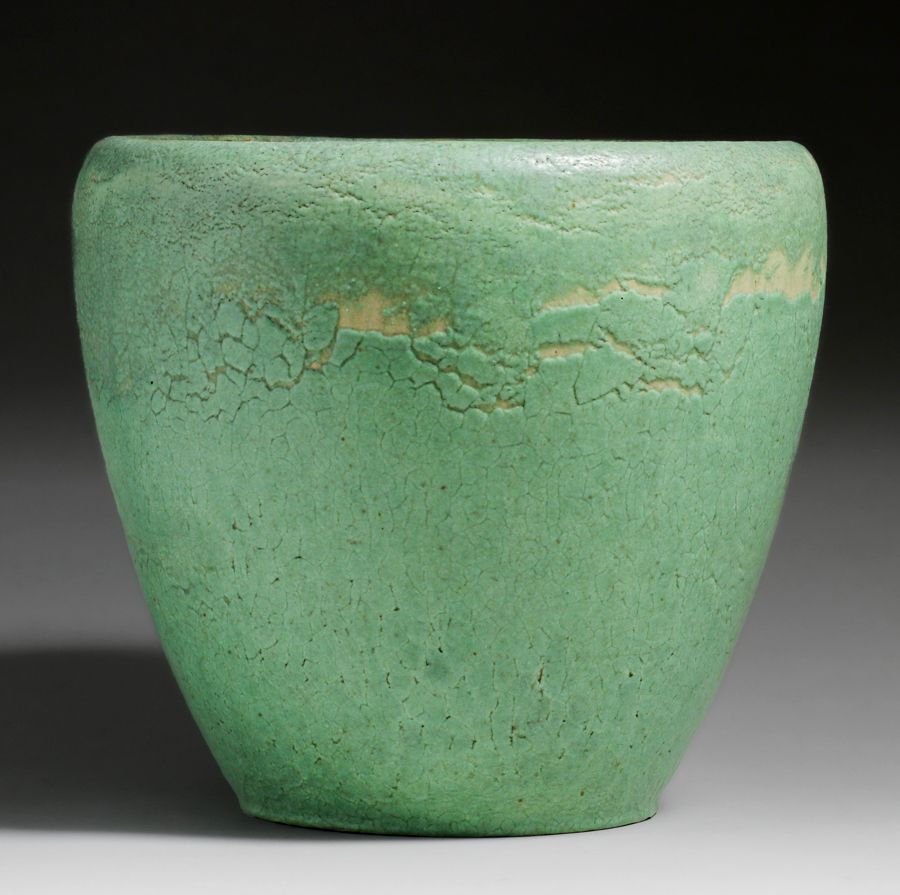 Large Grueby Pottery Matte Green Jardiniere c1910. Excellent curdled matte green glaze. Signed. Invisible professional restoration to two small rim chips, otherwise perfect condition. 10"h x 11"d SOLD