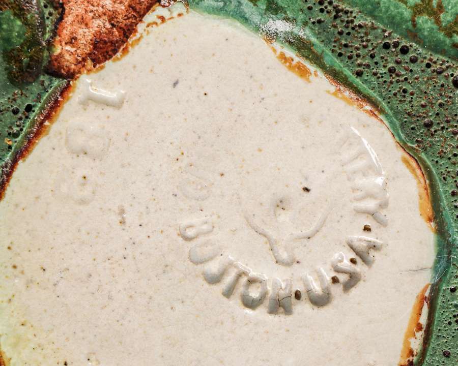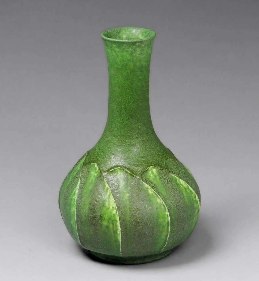 Unusual Grueby Pottery Matte Green Overlapping Leaf Vase c1905. Signed. A few tiny flecks to the high points of the leaves, otherwise perfect condition. 9 3/8"h x 5.5"d SOLD