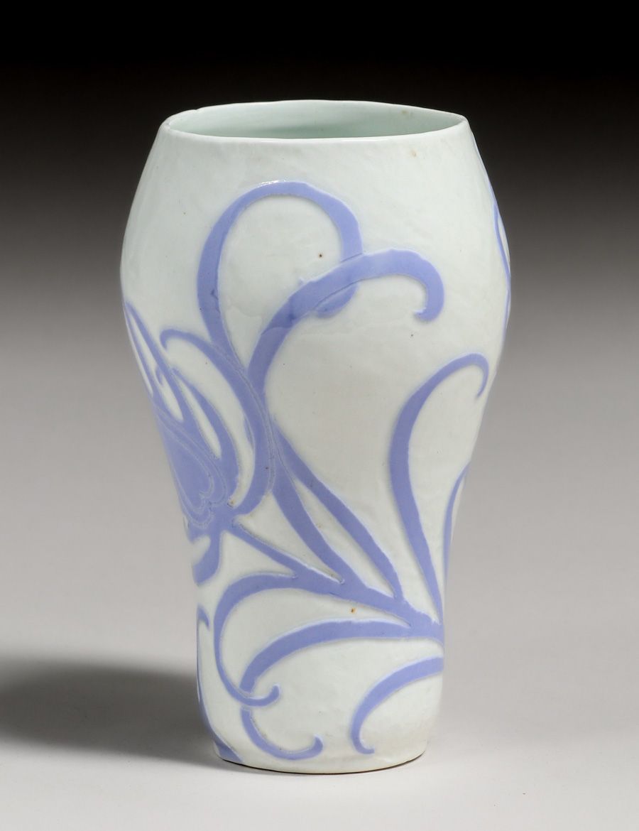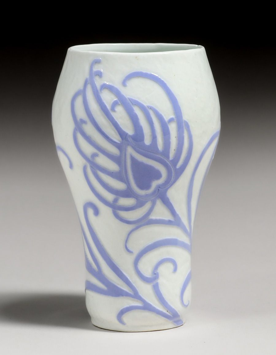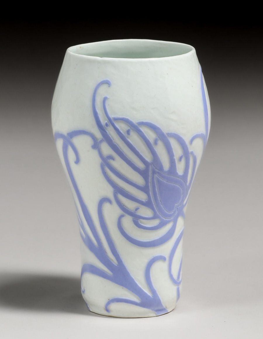 Josef Ekberg - Gustafsberg Swedish Carved Peacock Feather Porcelain Vase 1903. Signed. Perfect condition. 6.25"h x 3.5"d $1500