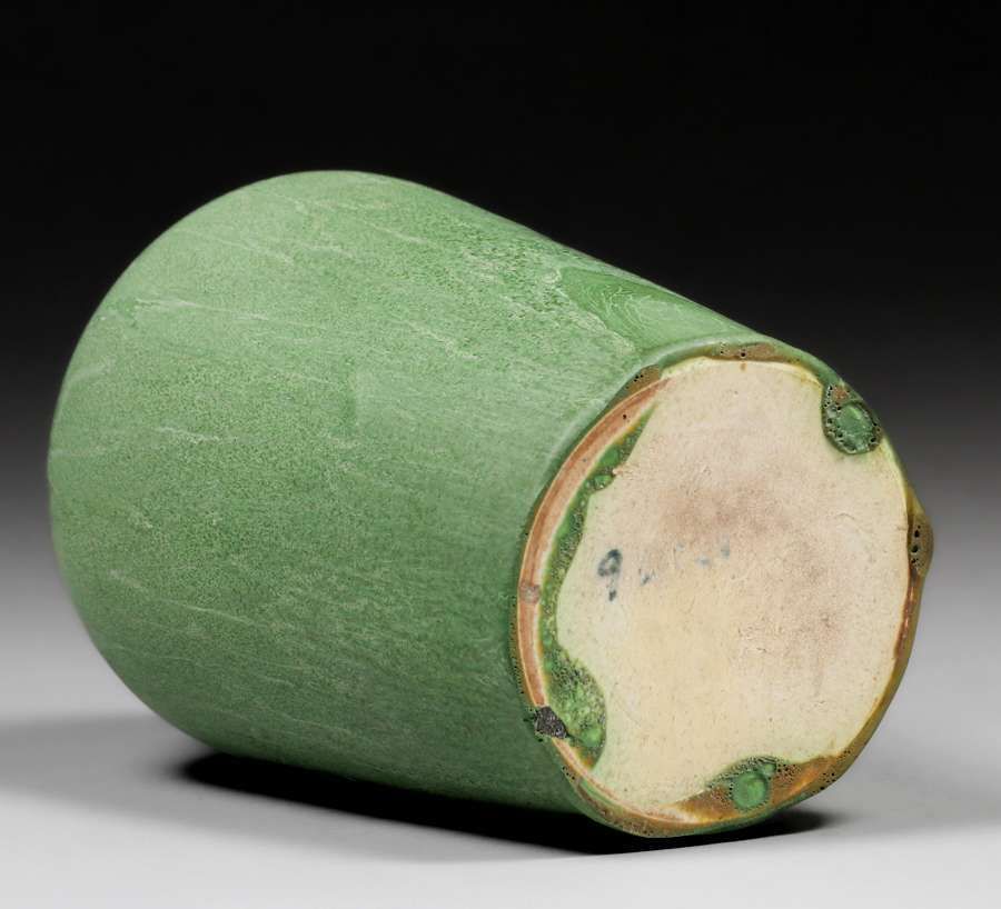 Hampshire Pottery Matte Green Vase c1910. Unsigned. Invisible professional restoration to small base chips, otherwise perfect condition. 6.75"h x 4"d SOLD