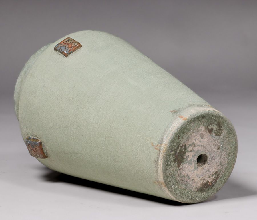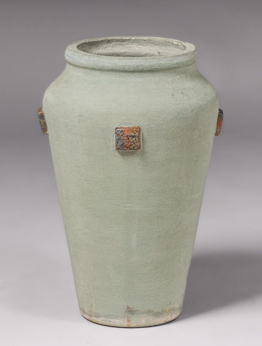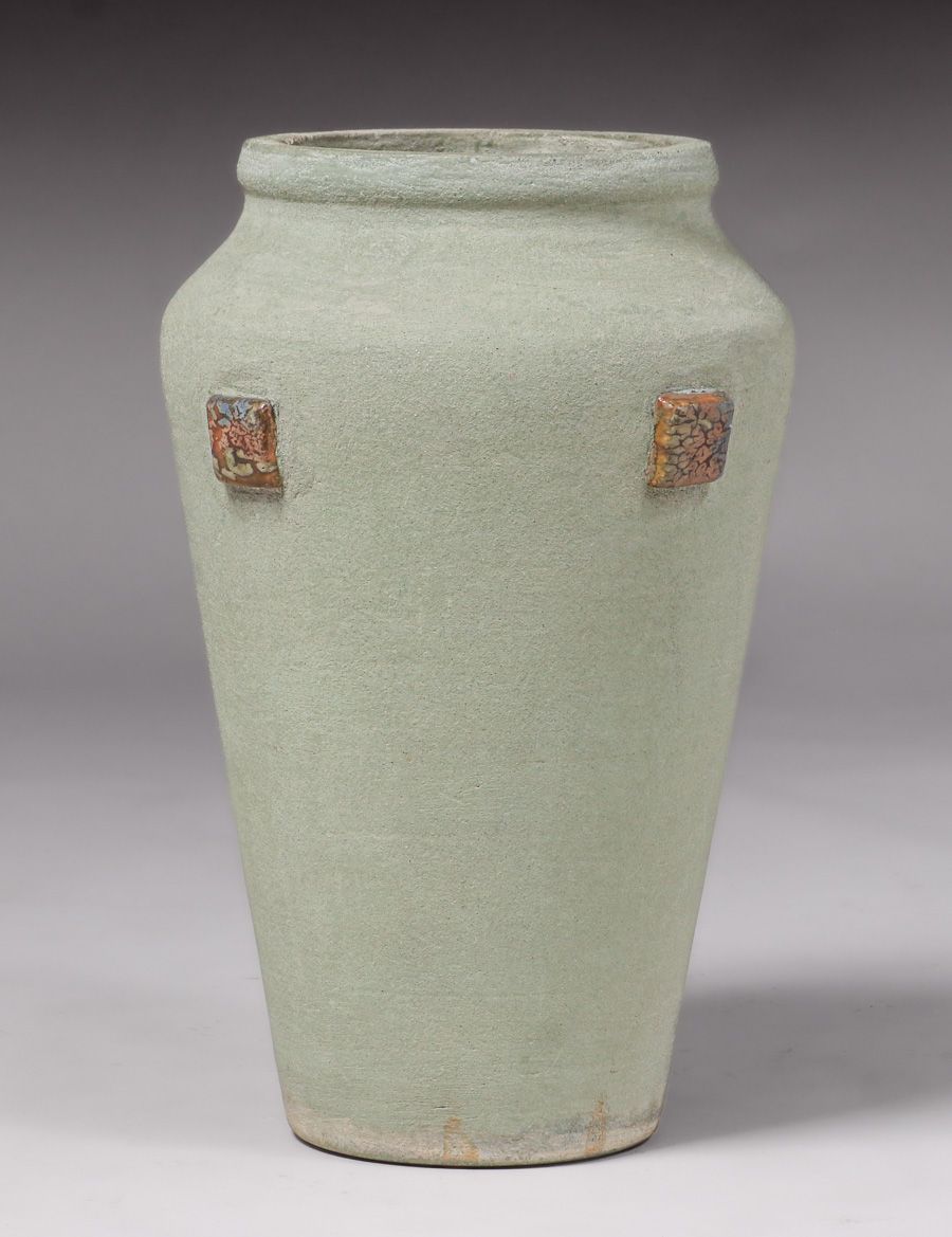 Hillside Pottery - Los Angeles Garden Vase c1920s. Unsigned. Invisible professional restoration to surface chips on tiles, light calcification staining on base, otherwise perfect condition. 20.25"h x 14"d SOLD