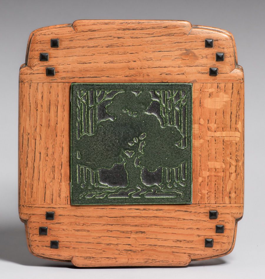 - Marblehead Arthur Baggs Carved Matte Green Oak Tree Tile c1908