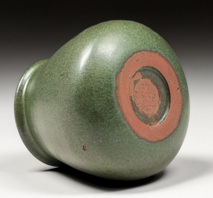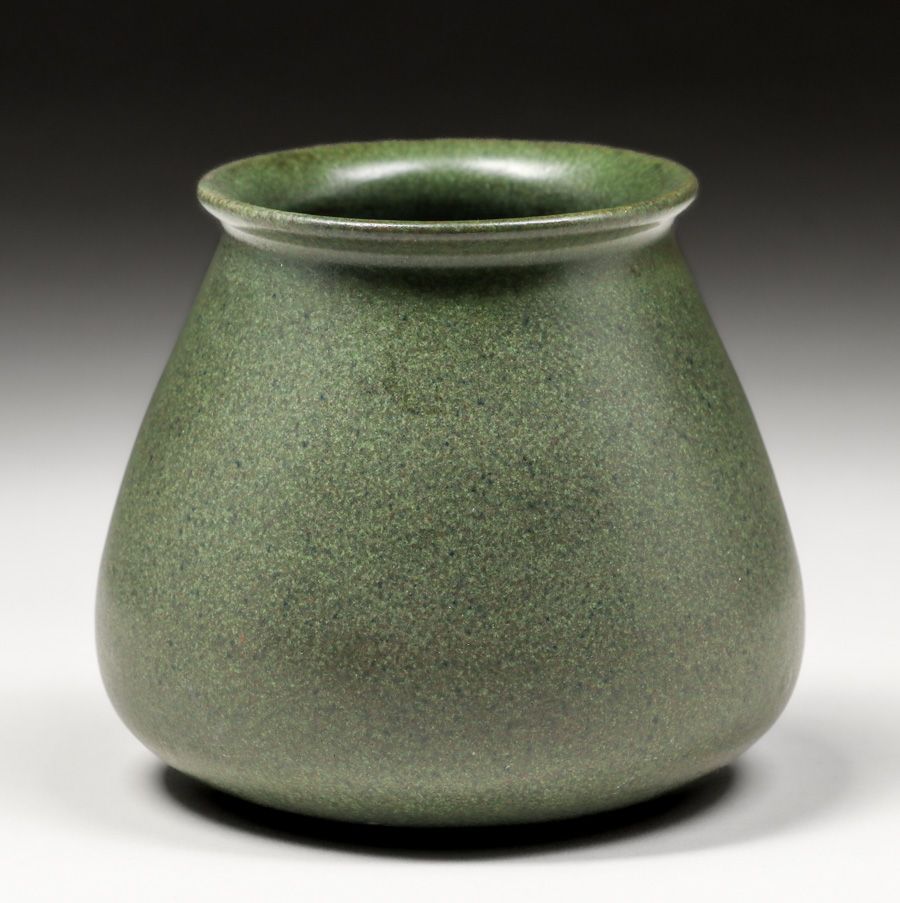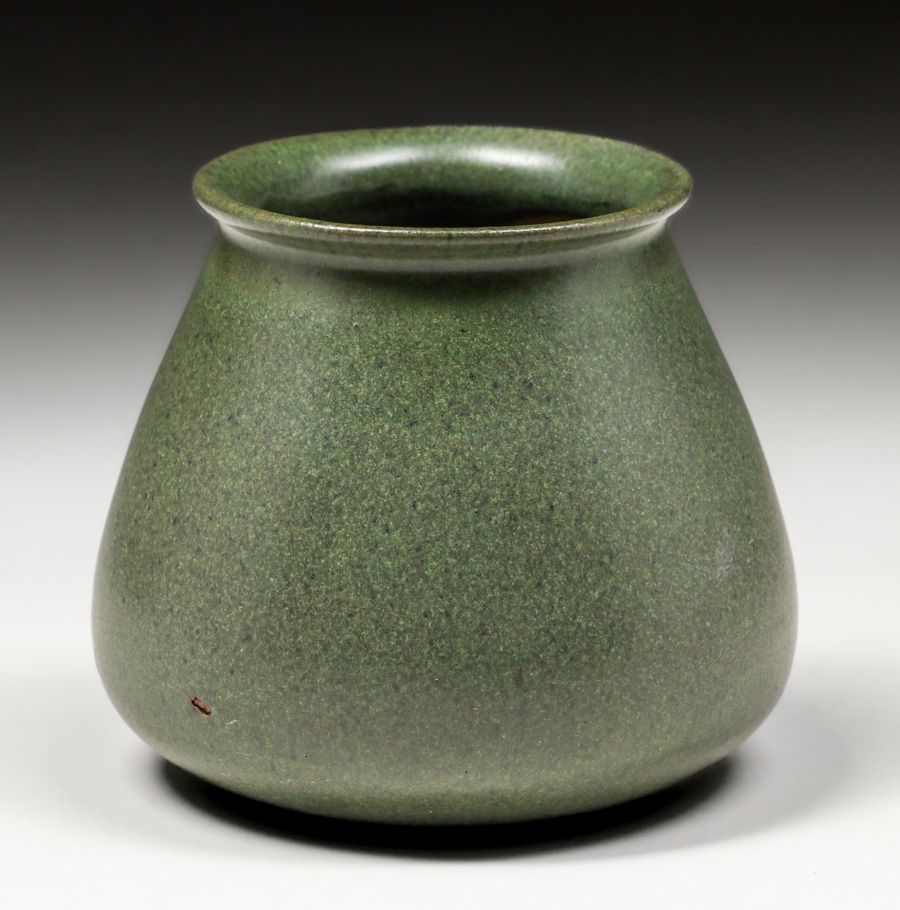 Marblehead Pottery Matte Green Vase c1910. Signed. Invisible professional restoration to small rim chip, otherwise perfect condition. 3.75"h x 4"d SOLD