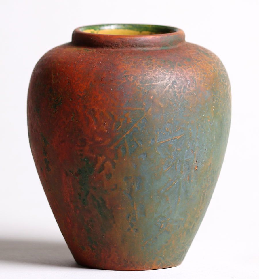 Markham Pottery – (Ann Arbor, MI 1905-1912) Reseau vase #3578. Markham Pottery moved to National City, CA in 1913. All Markham pieces were numbered with pieces above 6000 being attributed to National City. This vase dates to about 1908-1910 and has an exquisite reddish-green tone. Perfect condition 4.25″h x 3.75″d SOLD