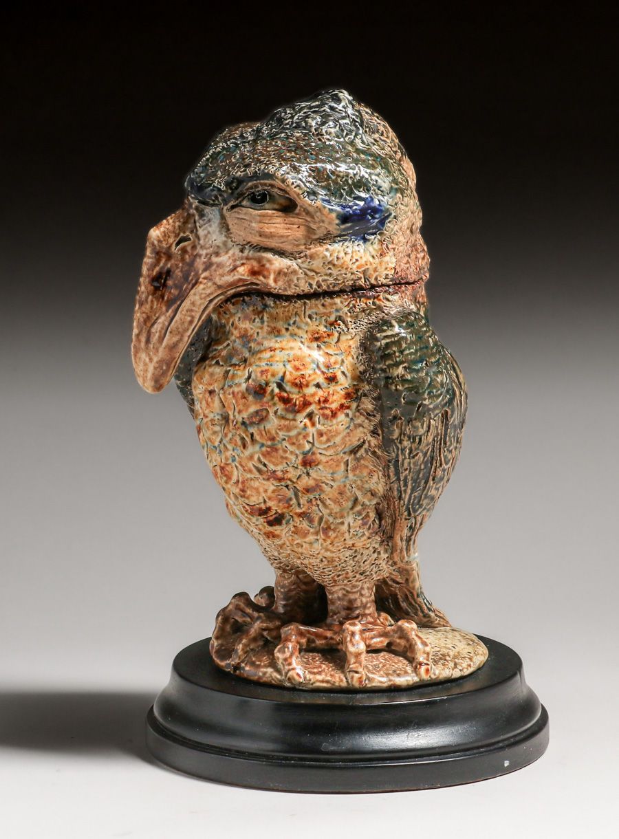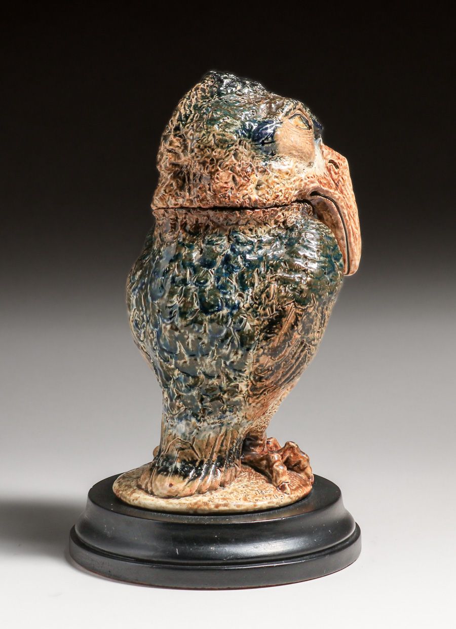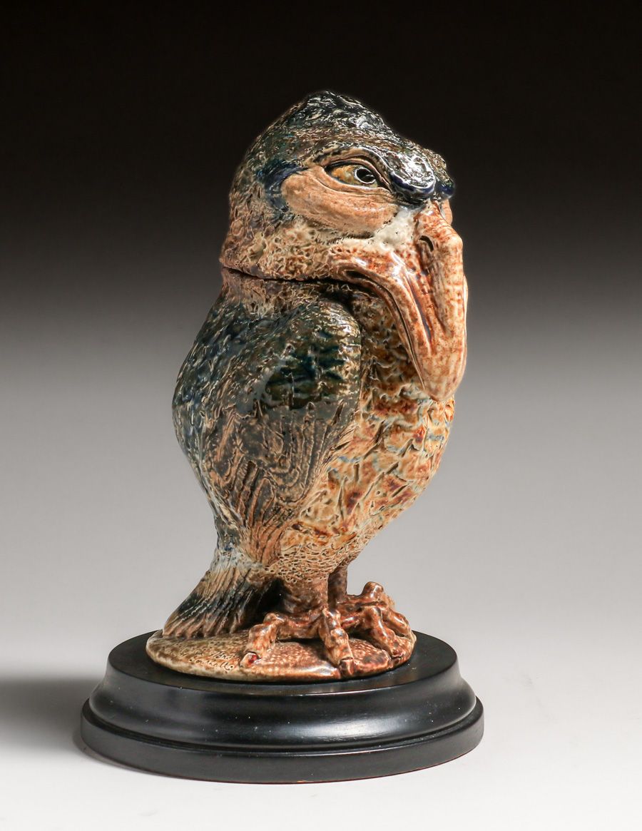 Martin Brothers Wally-Bird Salt-Glazed Tobacco Jar 1887. Signed. Glazed over firing line in tail. Perfect condition. 10 5/8"h × 6.75"w × 7.25"d SOLD