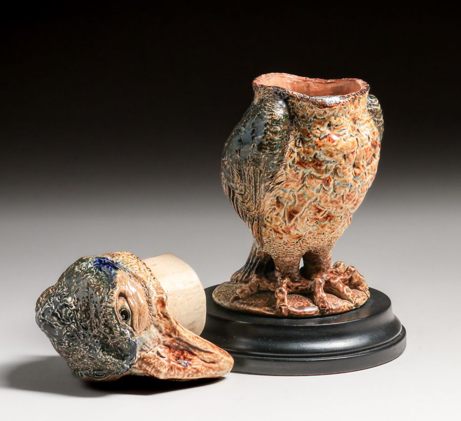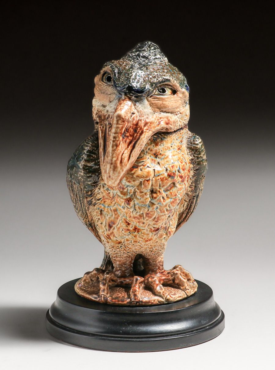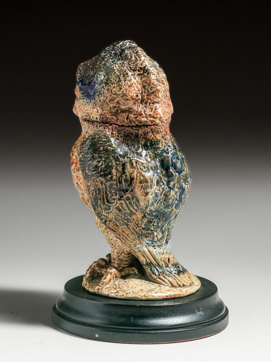 Martin Brothers Wally-Bird Salt-Glazed Tobacco Jar 1887. Signed. Glazed over firing line in tail. Perfect condition. 10 5/8"h × 6.75"w × 7.25"d SOLD