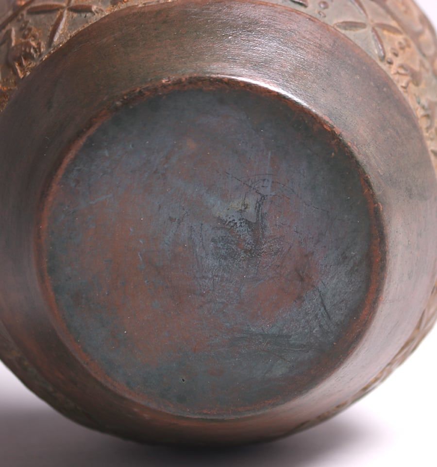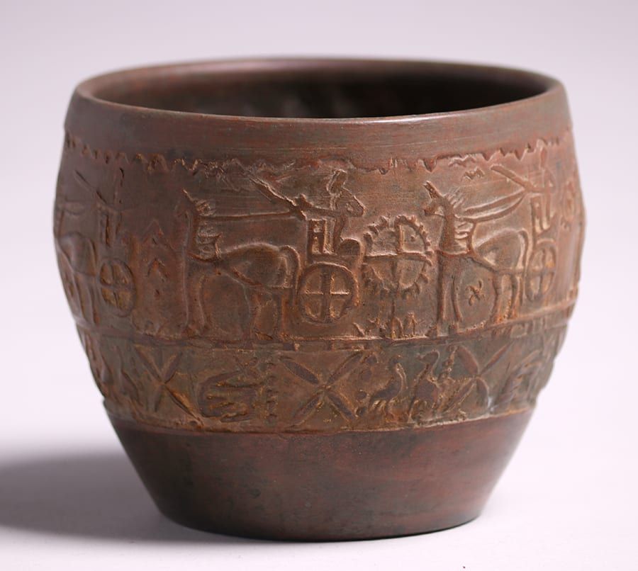 Merrimac Pottery Etruscan vase c1902-1903. Unsigned. Perfect condition. This extremely rare line of Merrimac Pottery was featured in The Craftsman Magazine June 1903, these vases were made from molds of original Roman Etruscan pottery at the Boston Museum of Fine Arts. 4"h x 4.75"d SOLD