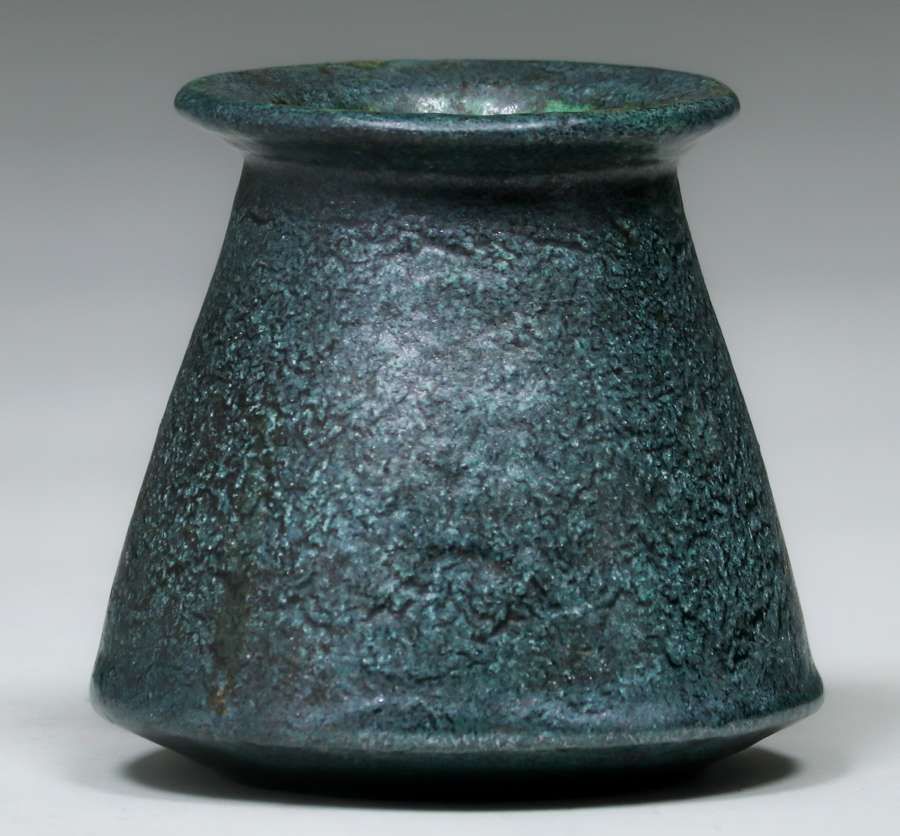 Merrimac Pottery Flared Dark Matte Green Cabinet Vase c1910. Glazed over signature. Invisible professional restoration to small rim chip, otherwise perfect condition. 3"h x 3"d SOLD