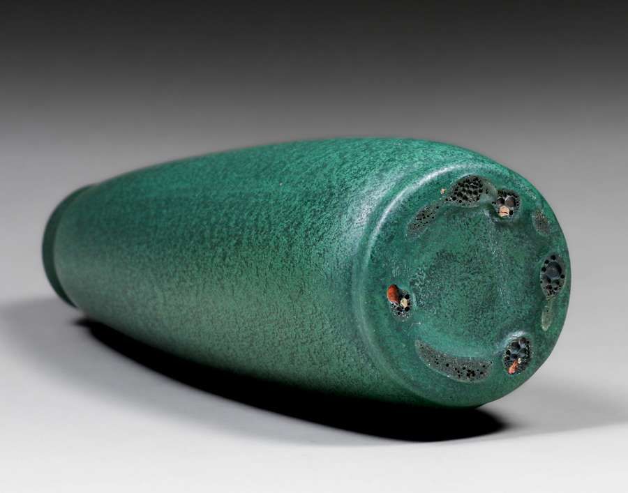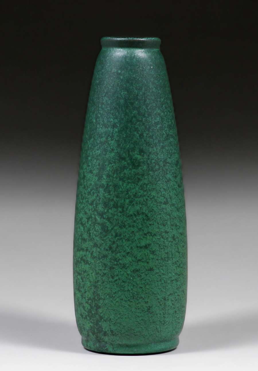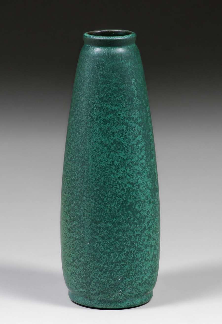 Merrimac Pottery Matte Green Vase c1905. Very faint Sturgeon Signature glazed over. Invisible professional restoration to 0.25" rim chip, otherwise perfect condition. 10.25"h x 3.25"d SOLD