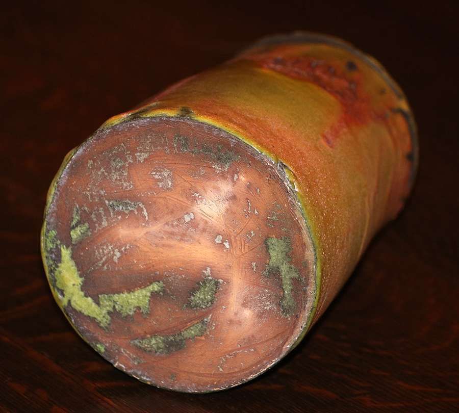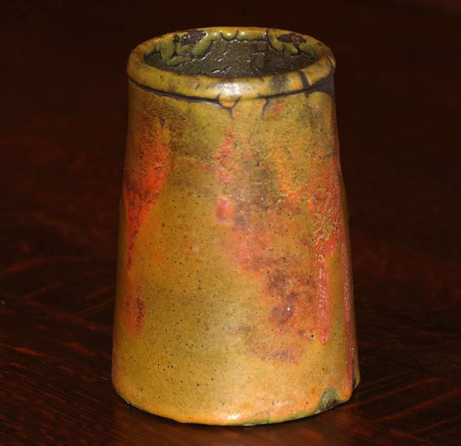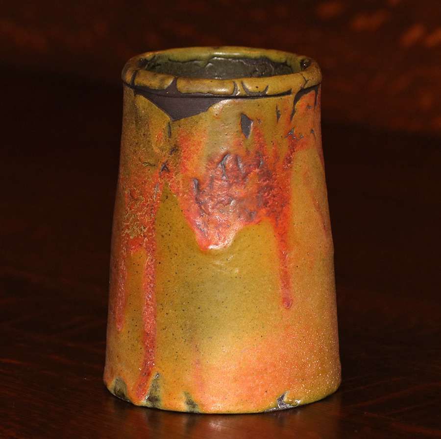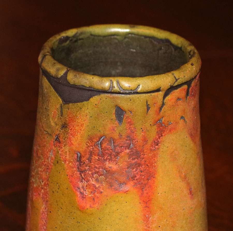 Merrimac Pottery tapered vase with dramatic yellow, green and orange glaze c1910. Partially glazed over Sturgeon mark. Perfect condition. 6"h x 4.25"d SOLD