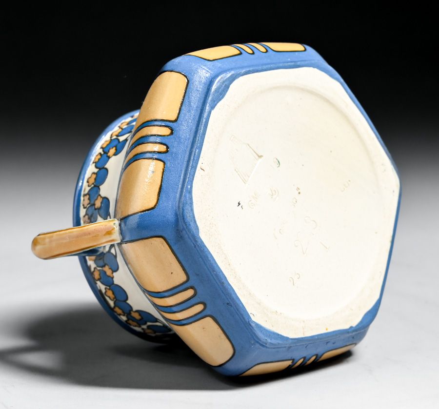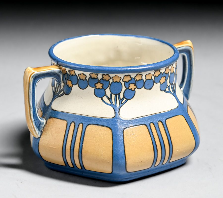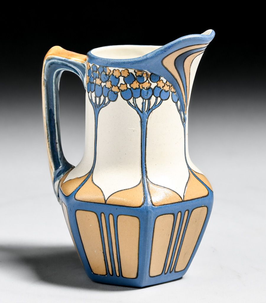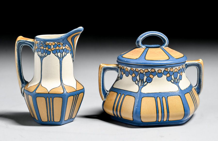 Metlach Pottery - German Arts & Crafts Sugar & Creamer Set c1910. Signed. Invisible professional restoration to a few small edge chips. Creamer 4.5"h x 3.25"w. Sugar 5"w x 4.25"h SOLD