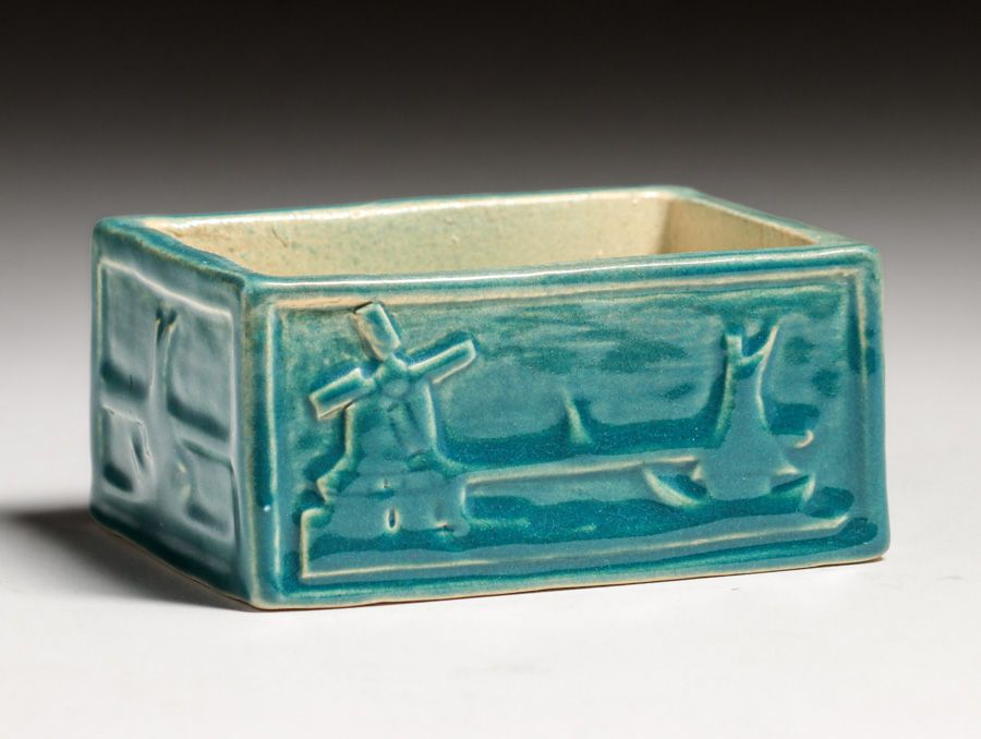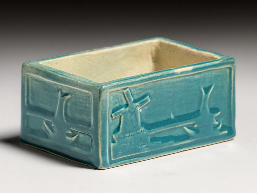 North Dakota School of Mines Dutch Windmill & Sailboat Carved Box 1935. Signed. Invisible professional restoration to small rim chip, otherwise perfect condition. SOLD