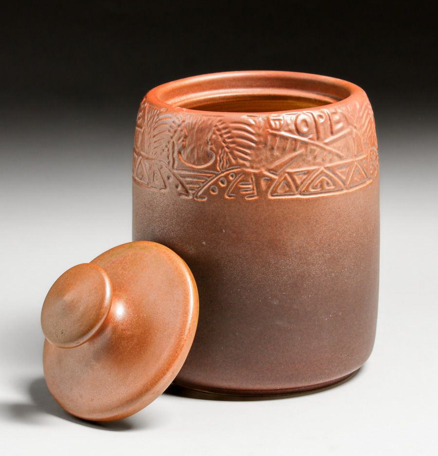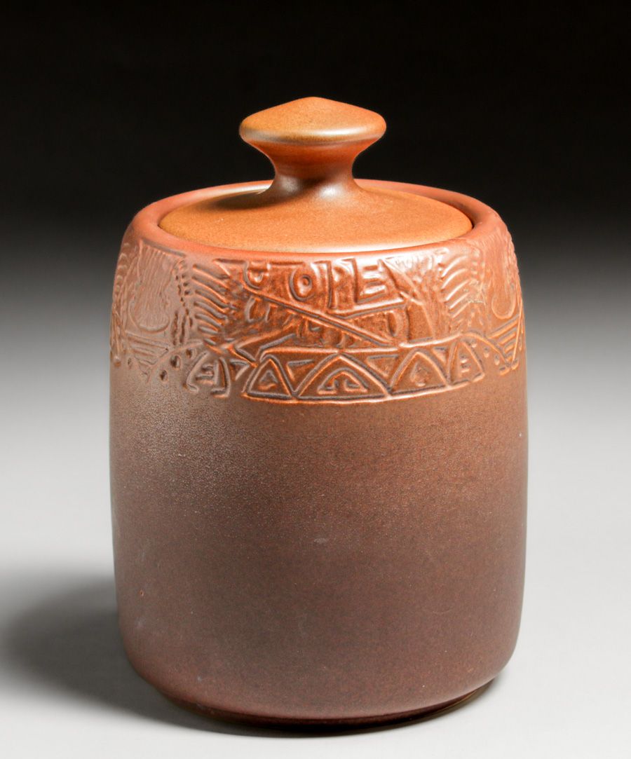 North Dakota School of Mines Julia Mattson Hand-Carved Native American Humidor after 1913. Exquisite example of NDSM Pottery with crisp definition. Signed. Perfect condition. 8.25"h x 5.5"d SOLD