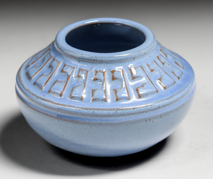 North Dakota School of Mines Julia Mattson Hand-Carved Vase c1920s. Signed. Perfect condition. 3″h x 4.25″d SOLD
