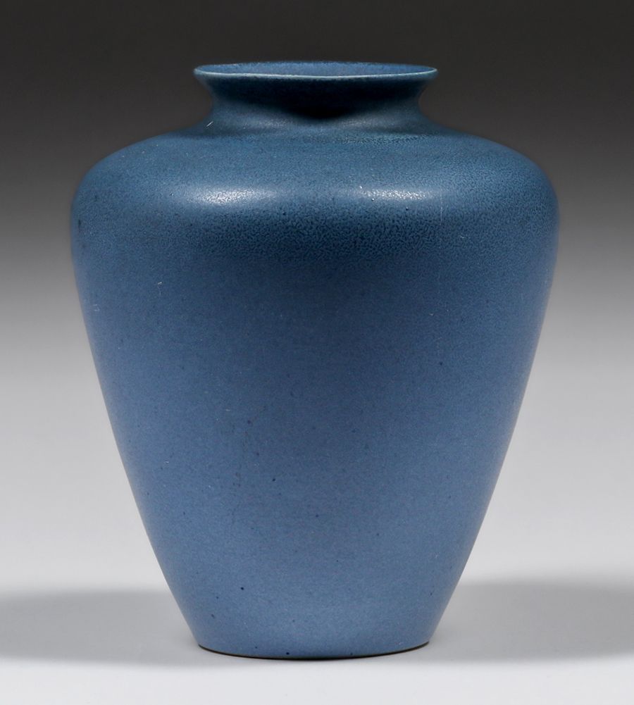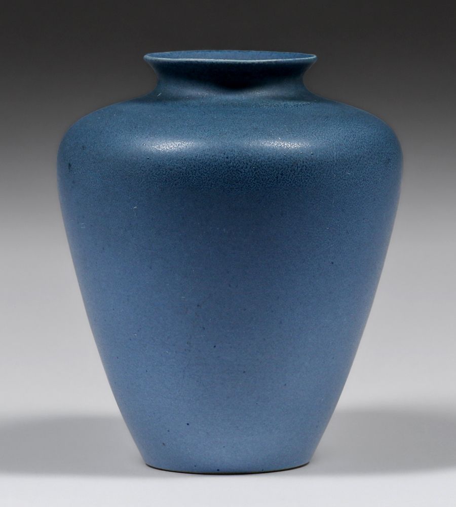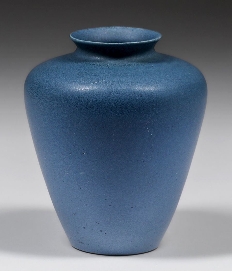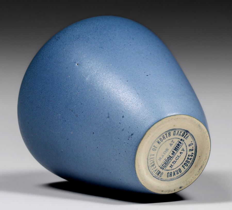 North Dakota School of Mines Matte Blue Vase c1920s. Signed. Invisible professional restoration to small rim chip, otherwise perfect condition. 6h x 4.75d inches SOLD