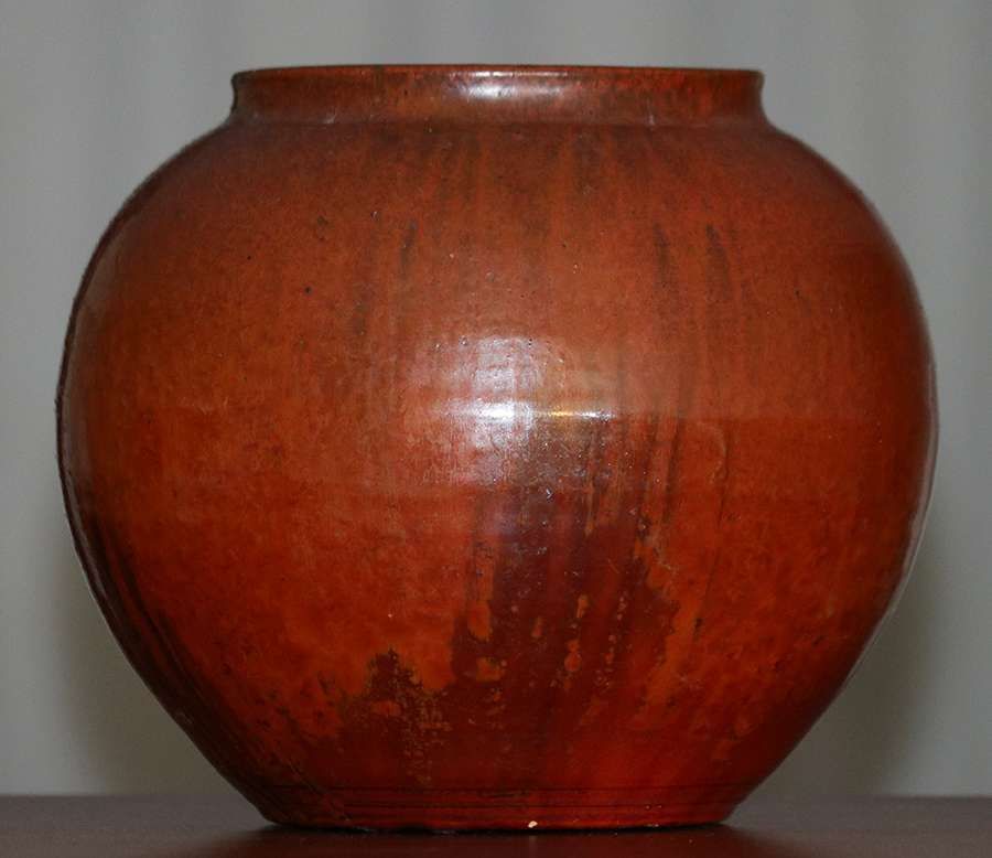 North State Pottery Co - Sanford, NC bulbous vase with Chrome Reddish Orange glaze c1930. Signed. Small base flake, otherwise perfect condition. 8.5"d x 7"h SOLD