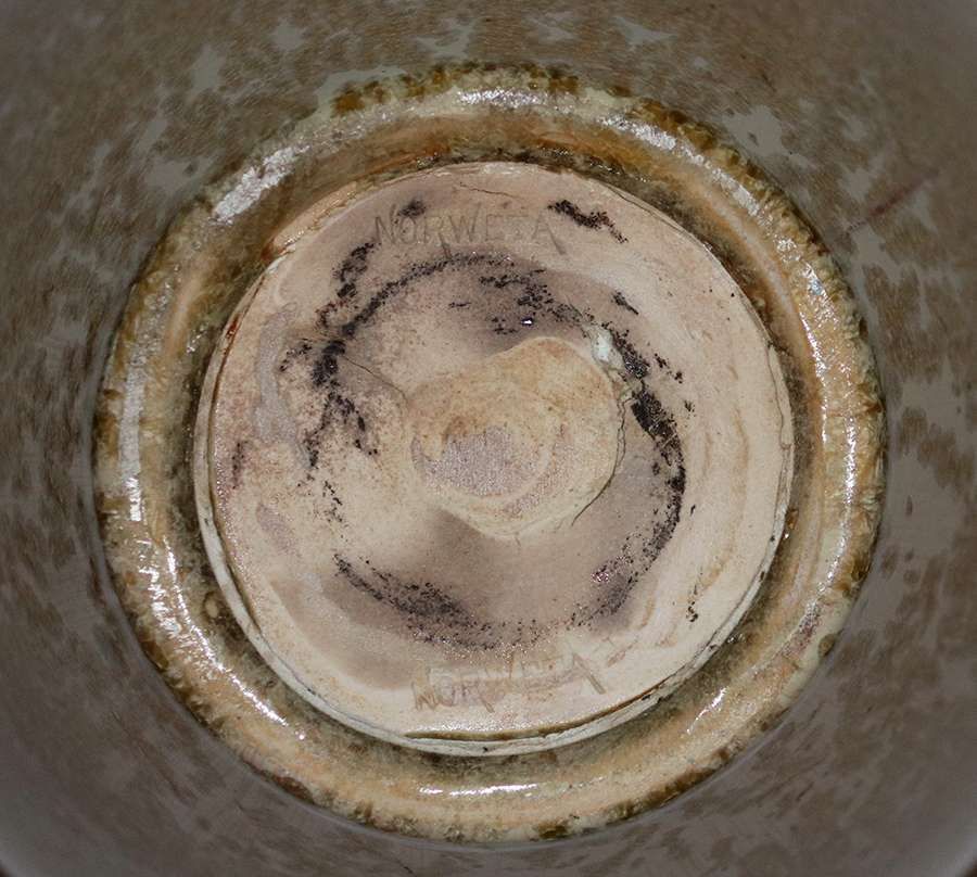 Norweta – Chicago vase with micro-crystalline glaze. Norweta (Northwestern Terra Cotta Co) was founded in 1886 but did not start making art pottery until 1906 upon hiring two of Teco designers, Fritz Albert and Fernand Moreau. They ceased production about 1920. Signed. Invisible professional restoration to rim chip, otherwise perfect condition. 8.5″h x 6″d SOLD