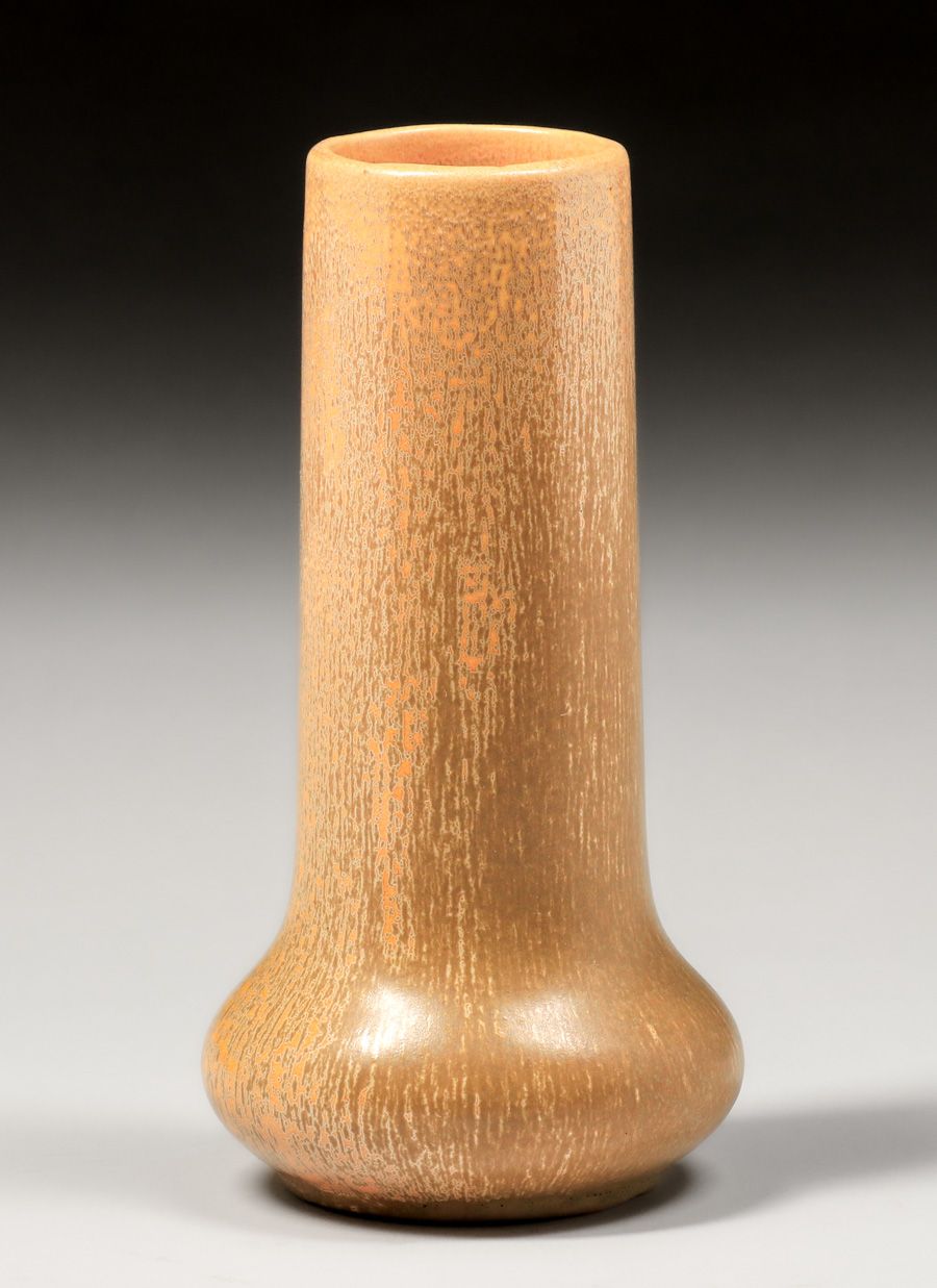 Norweta – Chicago Micro-Crystalline Vase after 1906. Norweta (Northwestern Terra Cotta Co) was founded in 1886 but did not start making art pottery until 1906 upon hiring two of Teco designers, Fritz Albert and Fernand Moreau. They ceased production about 1920. Unsigned. Perfect condition. 7.25″h x 3.75″d SOLD