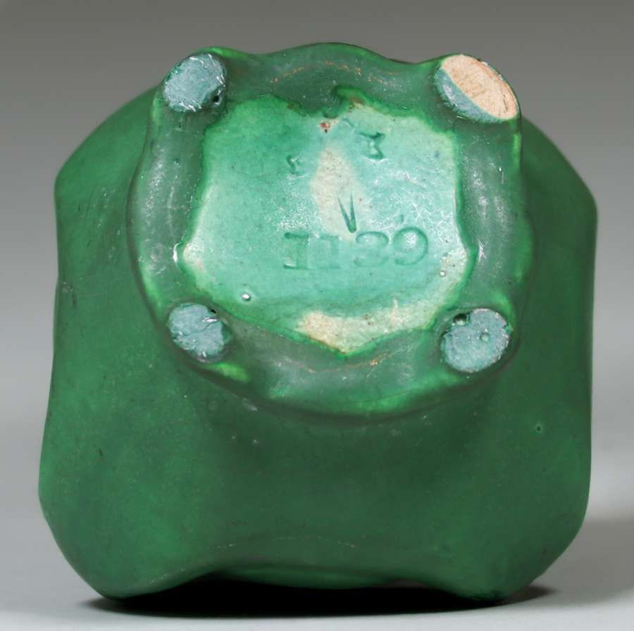 Owens Pottery Matte Green Cabinet Vase c1910. Signed. Nearly invisible professional restoration to small rim chip, otherwise perfect condition. 3"h x 3.25"d SOLD