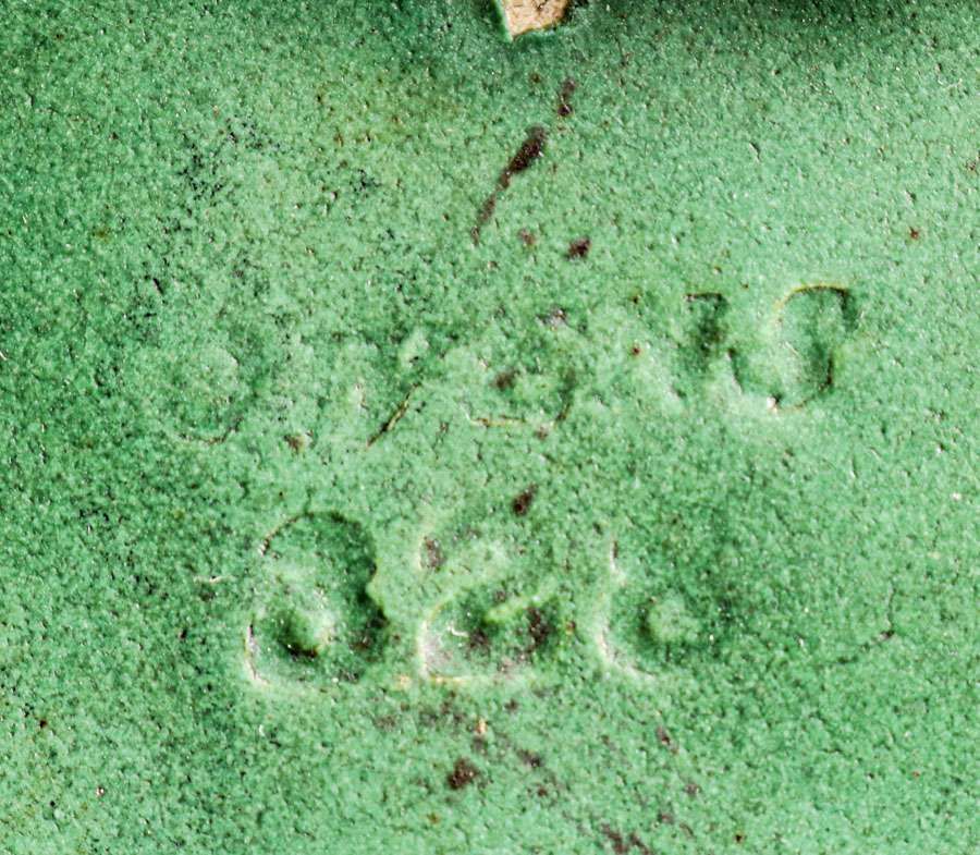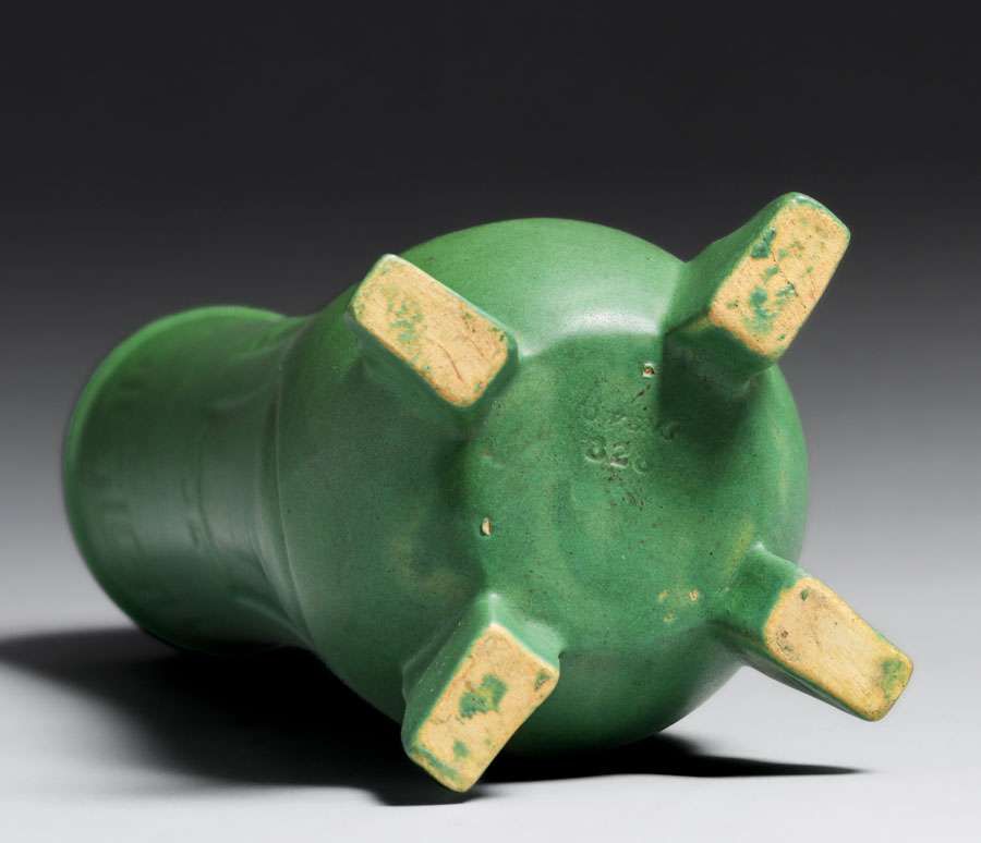 Owens Pottery Matte Green Vase c1910. Glazed over signature. Invisible professional restoration to small foot chips, otherwise perfect condition. 11"h x 5"d SOLD
