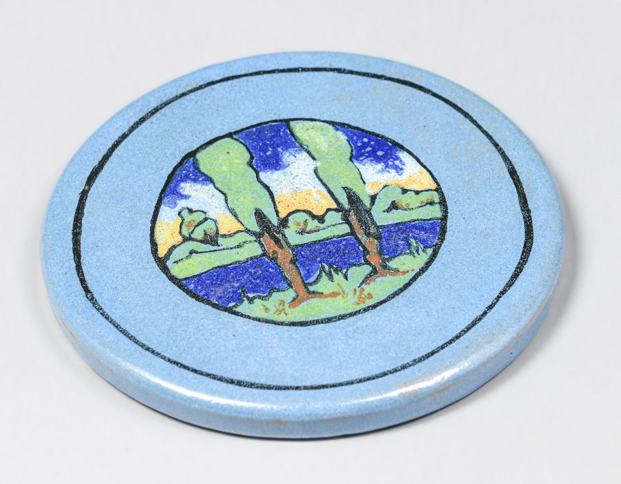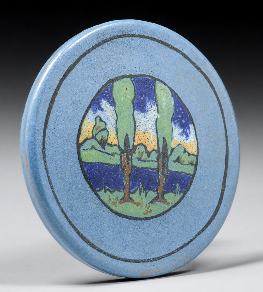 Paul Revere Pottery Arthur Wesley Dow Influenced Double Tree Landscape Decorated Tile 1928. Signed. Perfect condition. 5.5"d SOLD