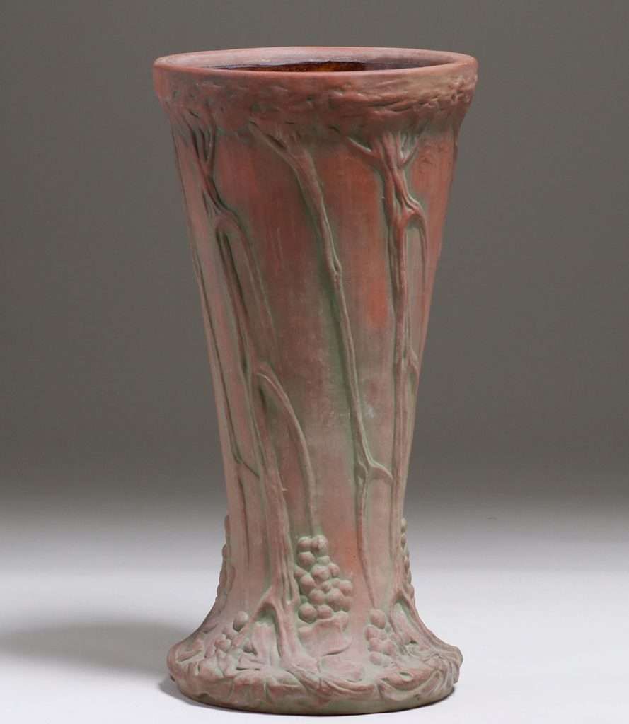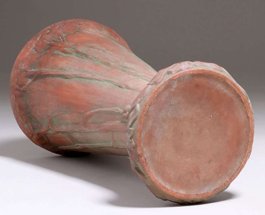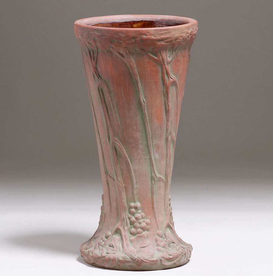 Large Peters & Reed Moss Aztec Umbrella Stand c1910s. Unsigned. Invisible professional restoration to two small chips, otherwise perfect condition. 22.75"h x 11.5"d SOLD