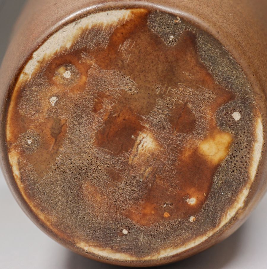 Early Pewabic Pottery Caramel Drip Glaze Vase c1903-1907. Signed with mostly glazed over early Five Maple Leaf Mark. Perfect condition. 9.25"h x 4.75"d SOLD