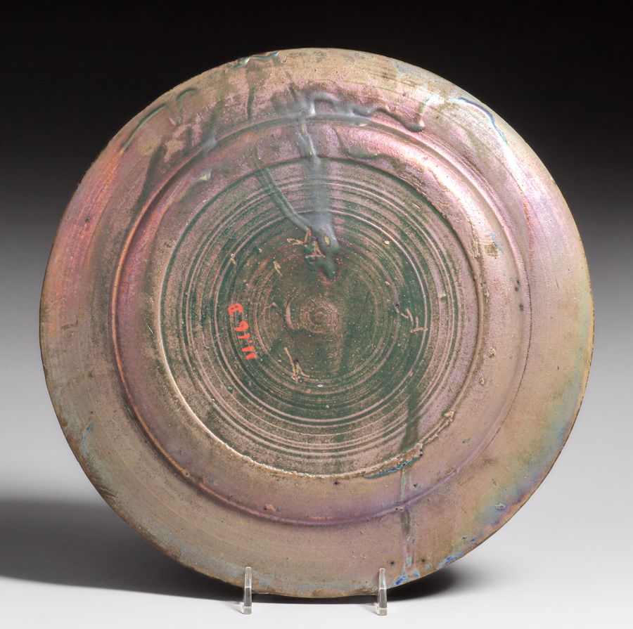 Early Pewabic Pottery Iridescent Apple Blossom Plate c1910. Artist initialed, otherwise unsigned. Perfect condition. 10 7/8"d $2200