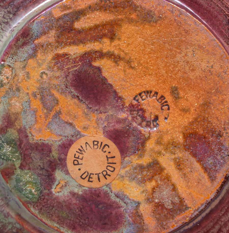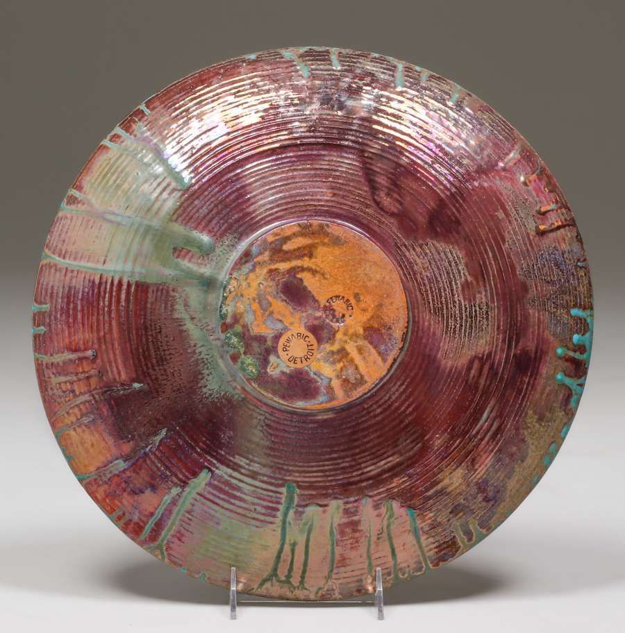 Large Pewabic Pottery Charger c1920s. Fantastic iridescent drip glaze. Invisible professional restoration to small edge chip, otherwise perfect condition. 14.25"d SOLD