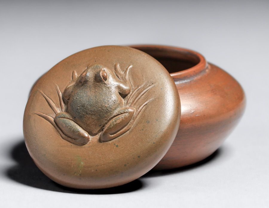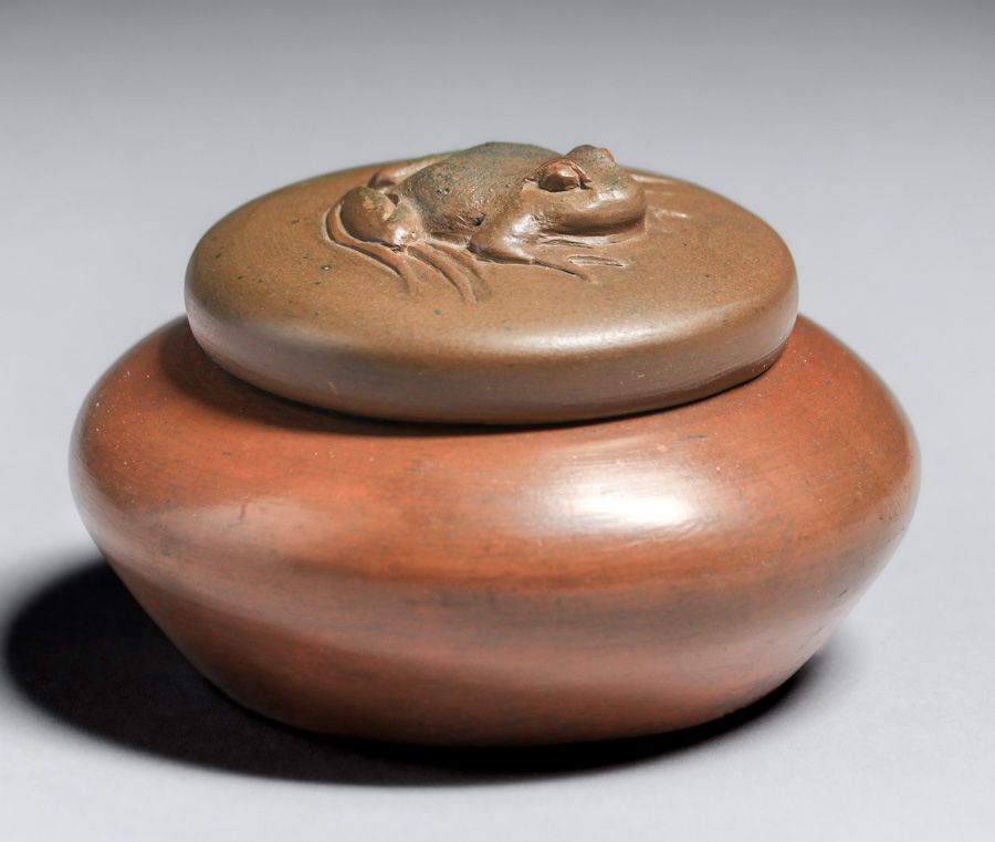 Rare Redlands Pottery Covered Frog Vase c1905. Signed with raised Redland Pottery mark. Redlands Pottery is among the rarest of California Potteries. Invisible professional restoration to small chip on inside of lid, otherwise perfect condition. 3.25″d x 2″h SOLD