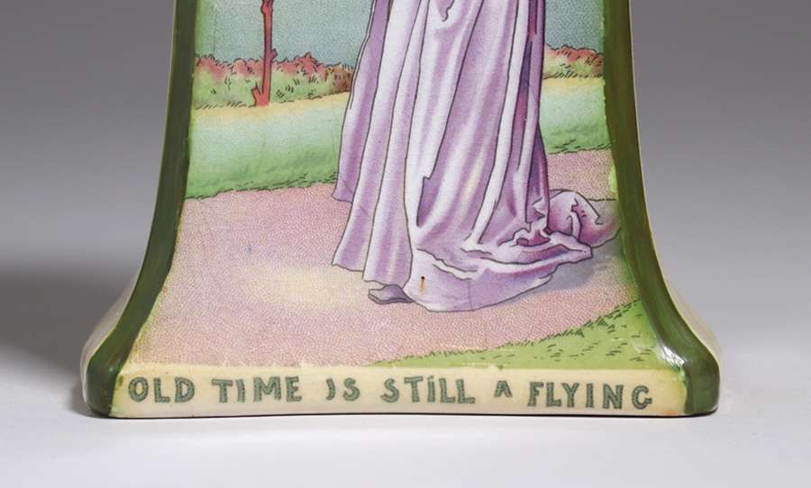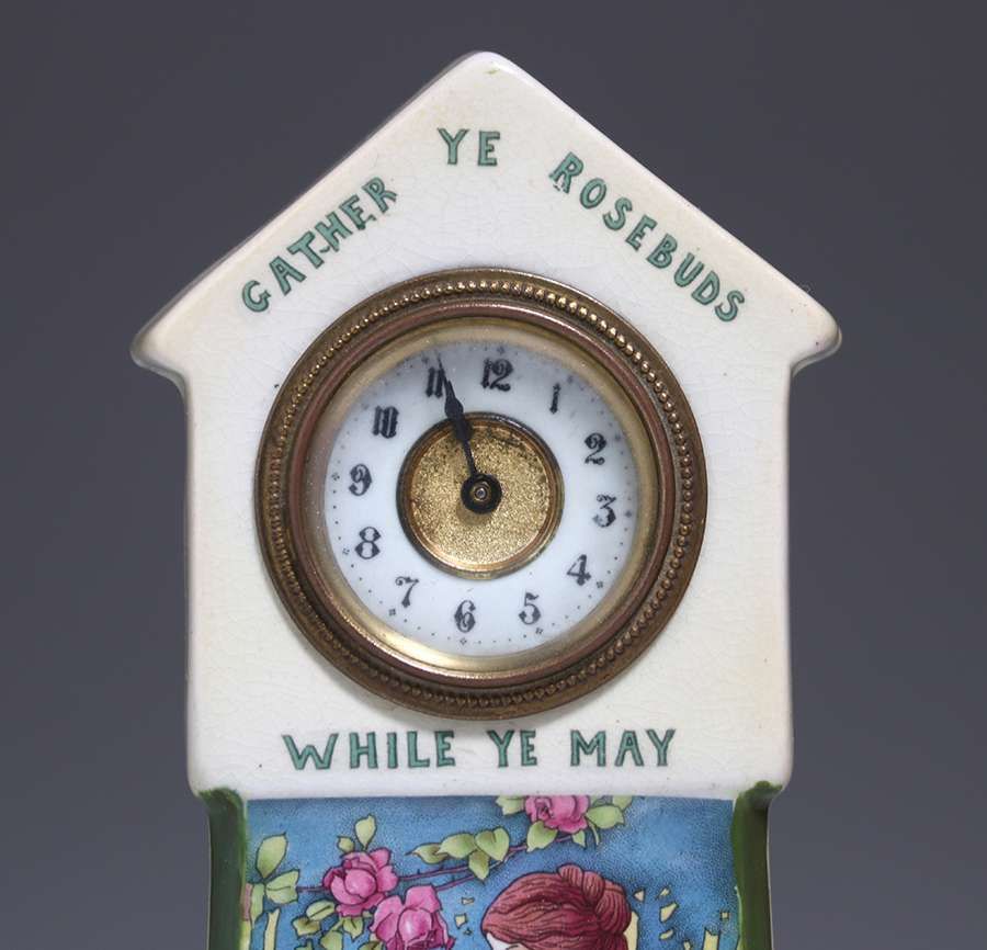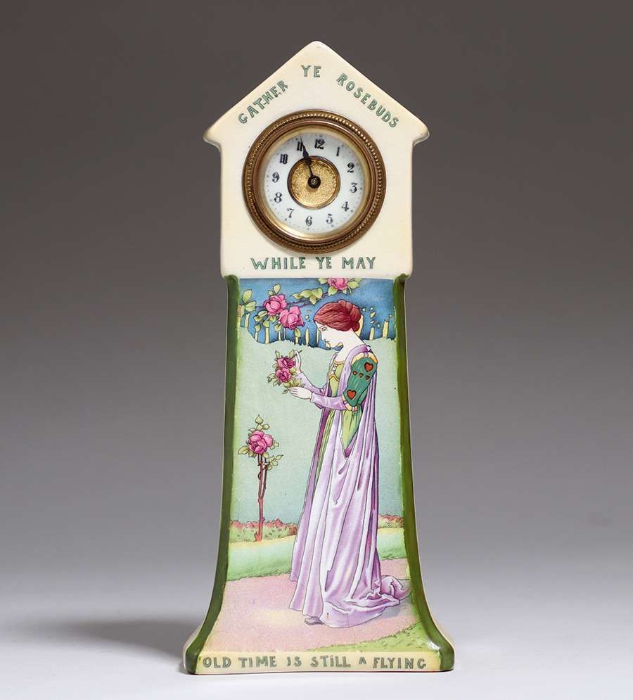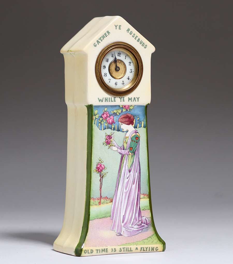 Frederick Rhead for Foley Pottery (England) mantle clock c1897-1900 with painted Pre-Raphaelite design “Gather Ye Rosebuds While Ye May Old Time is Still a Flying”. Invisible professional restoration to small edge chips, otherwise perfect condition. 11″h x 4.75″w x 2.75″d SOLD