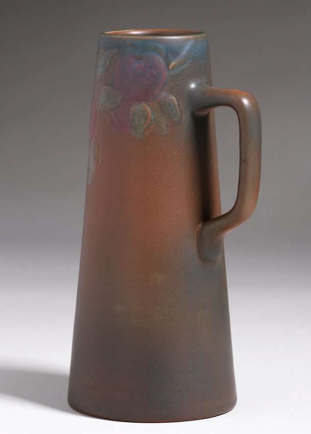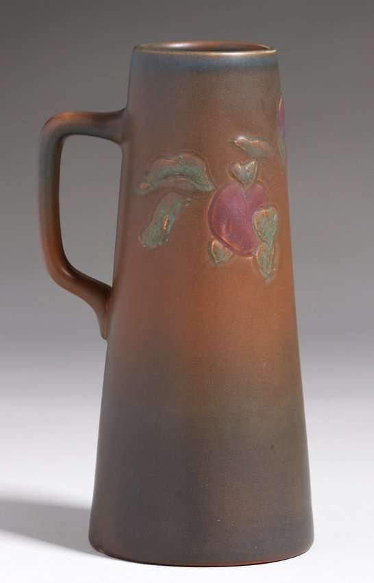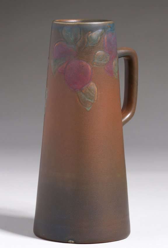 Spend $5000 or more at this auction and all of your SHIPPING IS FREE within the lower 48 states. SHIPPING We box and ship ourselves, to keep shipping costs low. We do not use a packaging service, unless the customer prefers us to use them. We can ship either USPS or Fed Ex Ground. Larger piece are shipped via Steve Auger Shipping. He travels coast to coast every month delivering antiques and fine furniture blanket wrap coast to coast. Most larger pieces can be hand delivered for $300 almost anywhere in the lower 48 states. For estimated shipping times of larger pieces, please call or email us before you bid. "}" data-sheets-userformat="{"2":4098,"4":[null,2,16043212],"15":"Proxima Nova"}">Rookwood pitcher with hand-carved apples decorated by Charles S. Todd and dated 1912. X'd because of glaze skip at base edge, otherwise perfect condition. 12"h x 5.25"d SOLD
