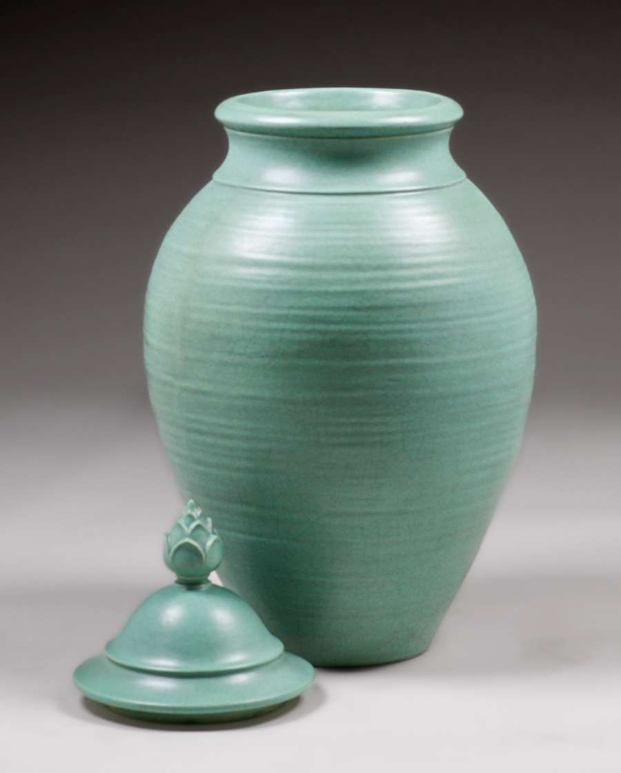 Rookwood Faience #8076Y Garden Temple Jar c1910. Signed. Invisible professional restoration to firing line and small chip to lid, otherwise perfect condition. 35"h x 16.5"d SOLD