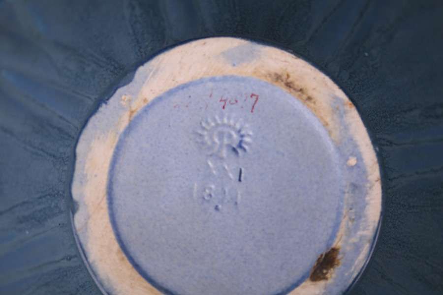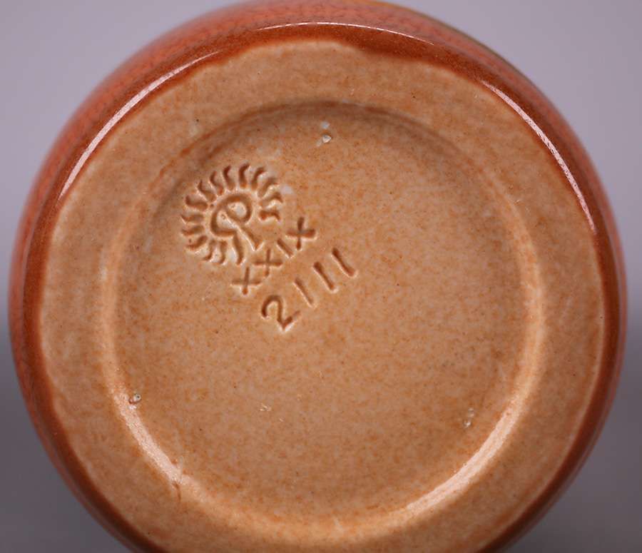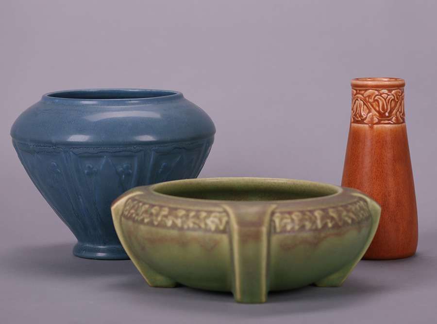 Rookwood Pottery : Rookwood matte blue vase #1311 dated 1921, 5.5"h x 6.5"d SOLD ; Rookwood matte green buttress bowl #1265 dated 1912, 8.5"d x 3.25"h SOLD ; Rookwood orange-brown vase #2111 dated 1929, 6"h SOLD