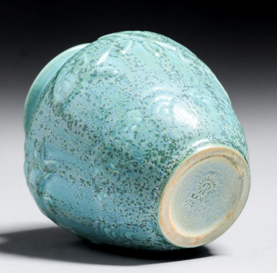 Rookwood Pottery #6487 Light Blue Crystalline Koi Fish Vase 1935. Kataro Shirayamadani design. Signed. Perfect condition. 4.5"h x 4.25"d SOLD