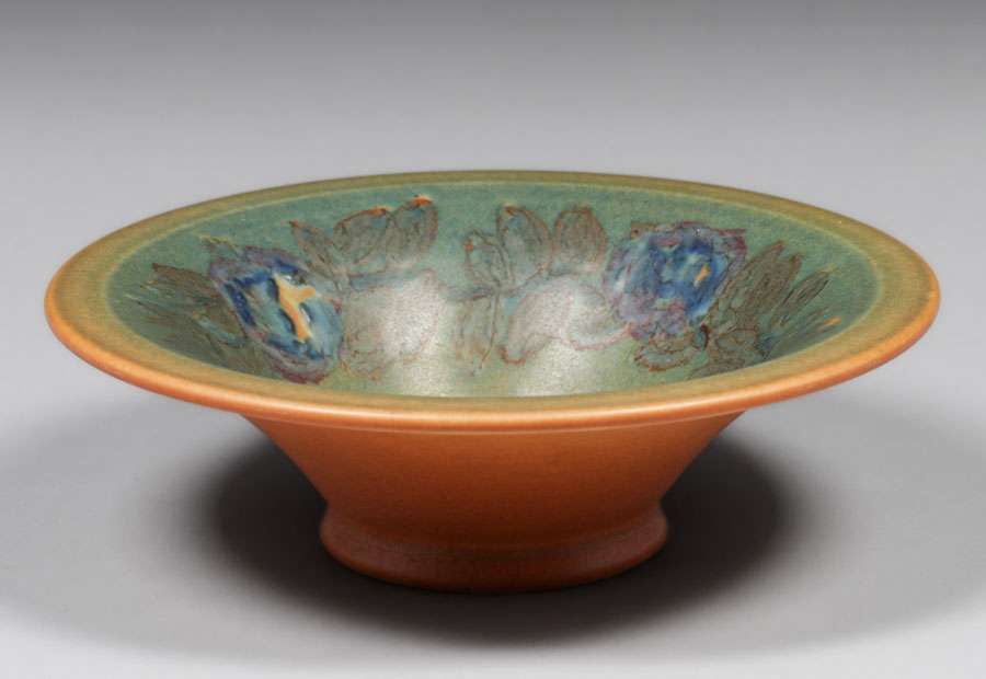 Rookwood Pottery Elizabeth F. McDermott Decorated Bowl 1925. Signed. X'd because of the build up of glaze within blue flowers, otherwise perfect condition. 7 5/8"d x 2.25"h SOLD