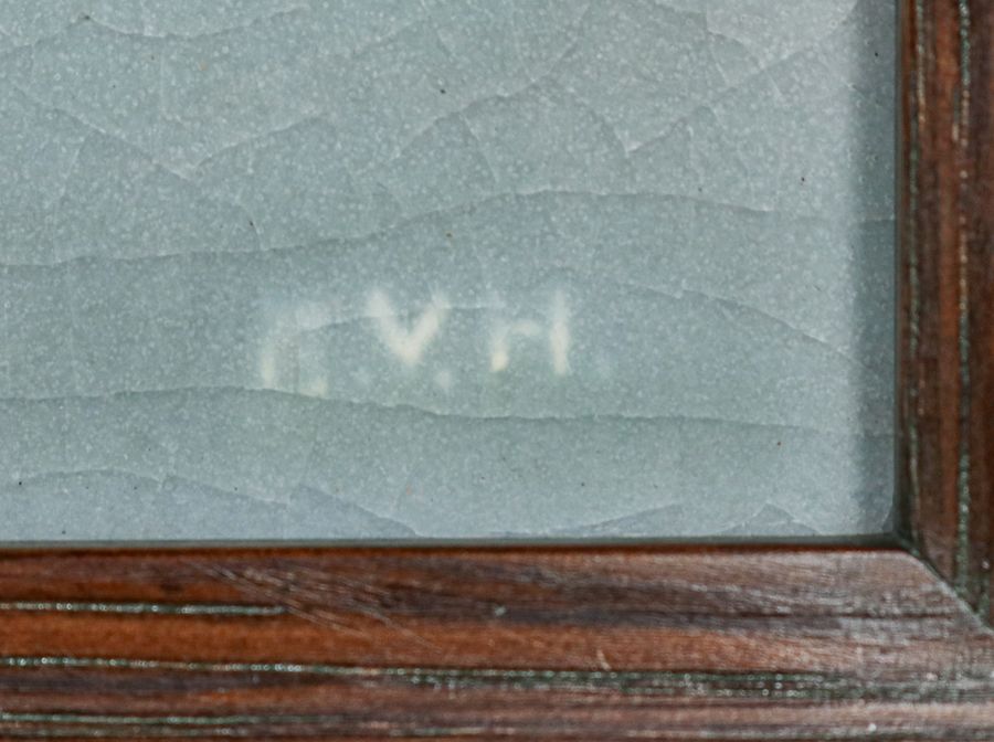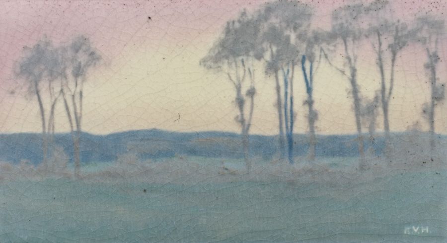 Rookwood Pottery Scenic Plaque 1915. Artist signed "E.V.H." Perfect condition. Tim Holton custom oak frame. 5 1/8h x 9 3/8w. Frame 10h x 14w inches $4800