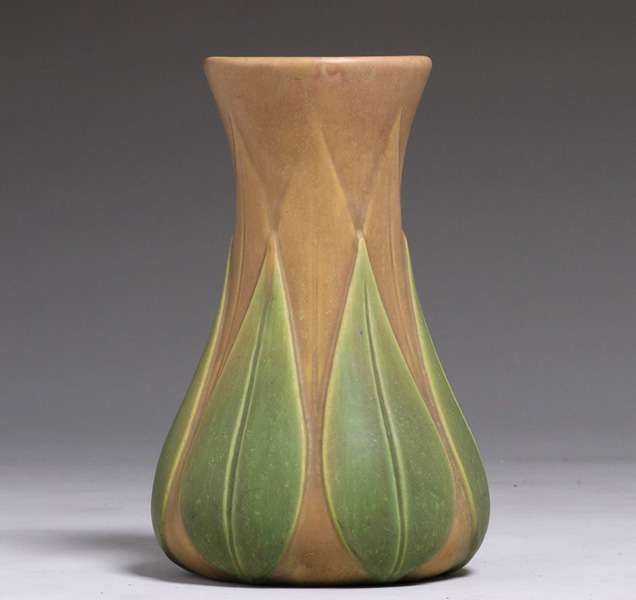 Large Roseville Early Velmoss flared vase. Unsigned. Invisible professional restoration to tight hairline, otherwise perfect condition. 11.75"h x 7"d SOLD
