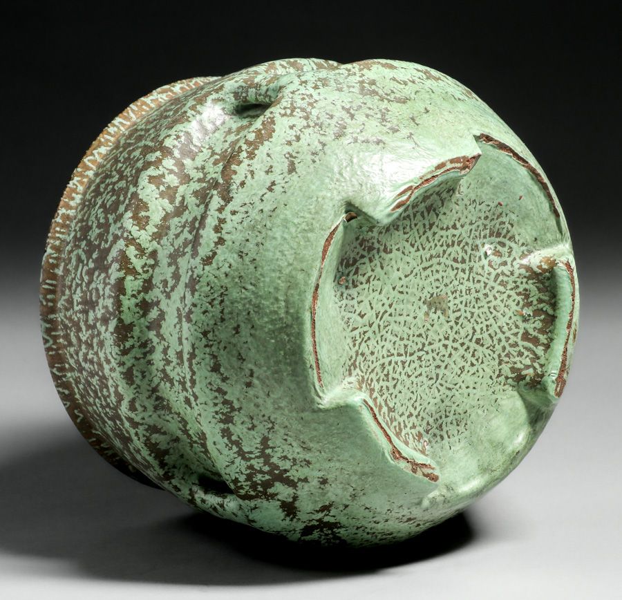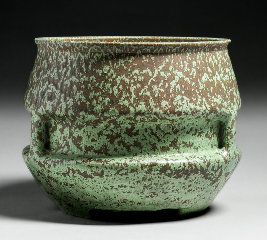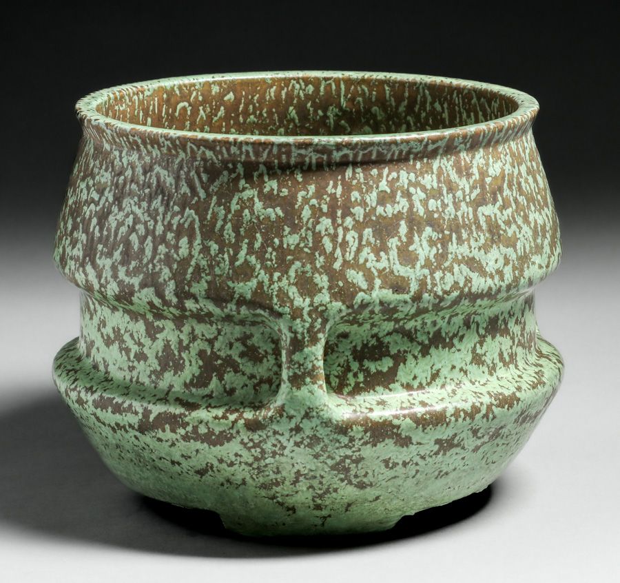 Roseville Chloron Matte Green Jardiniere c1910s. Unsigned. Some roughness to underside glaze drips, otherwise perfect condition. 10.25″d x 8.75″h SOLD
