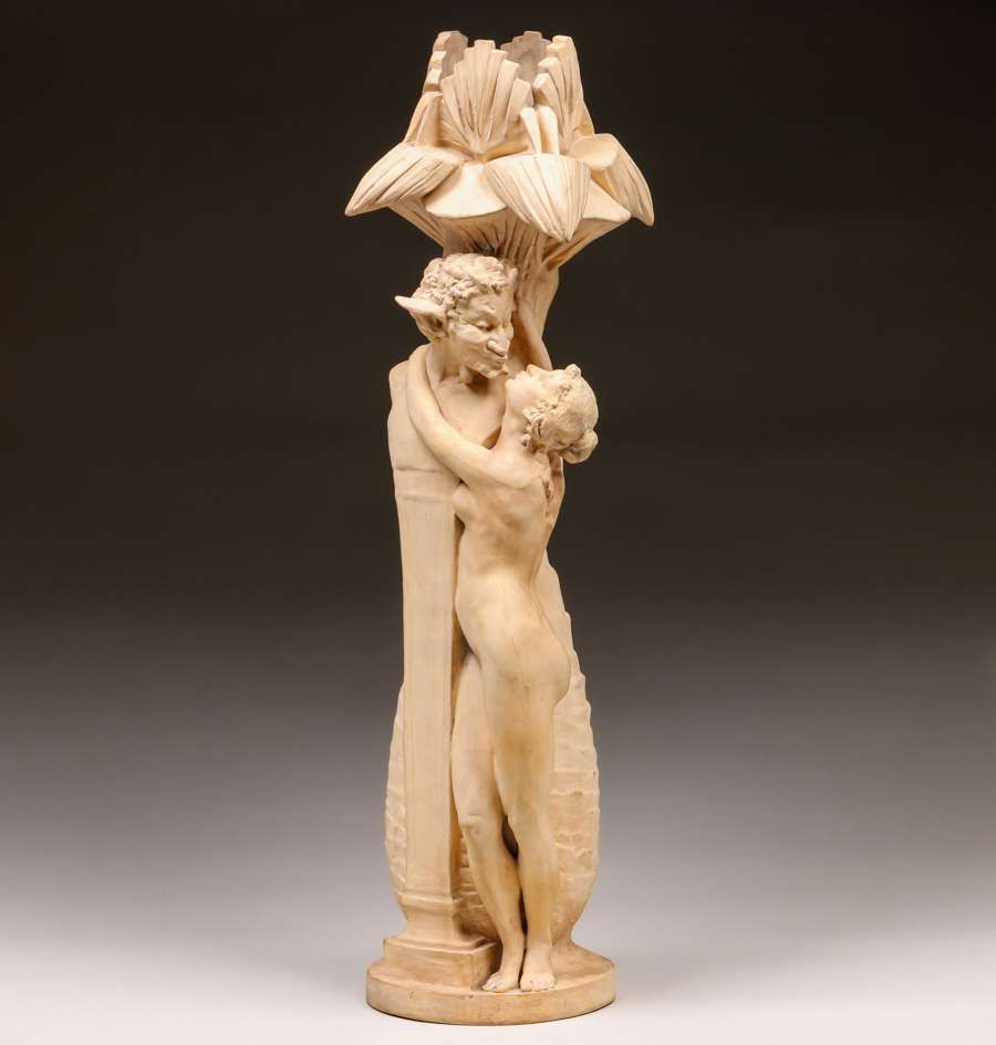 - Large Teco Pottery Bisque Vase Satyr & Nymph c1905