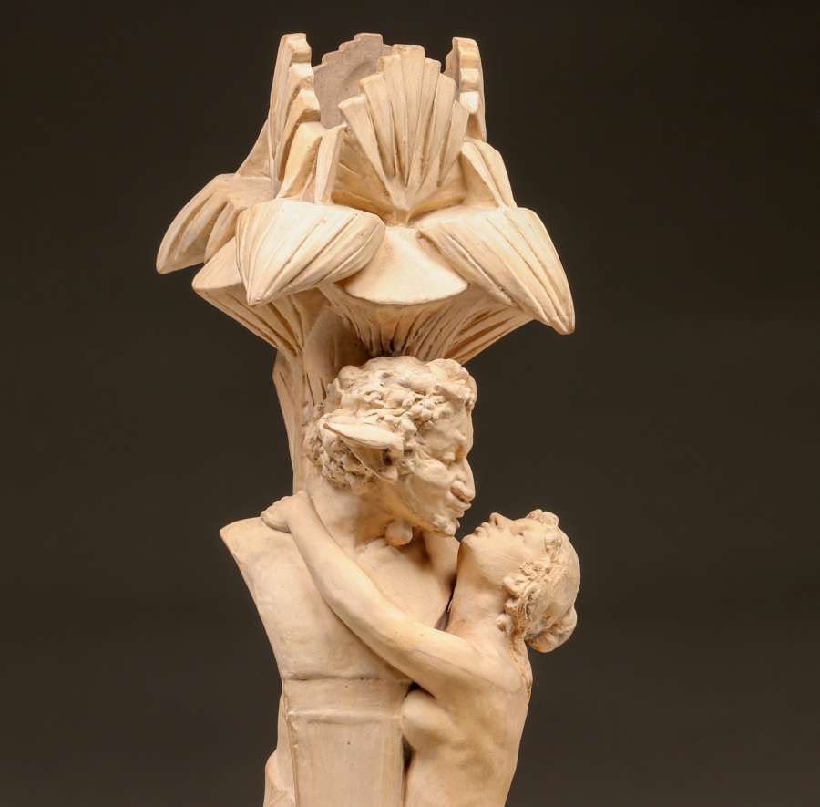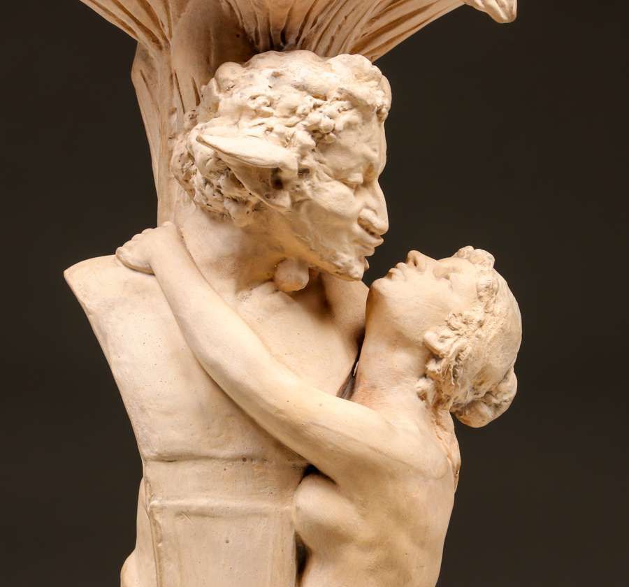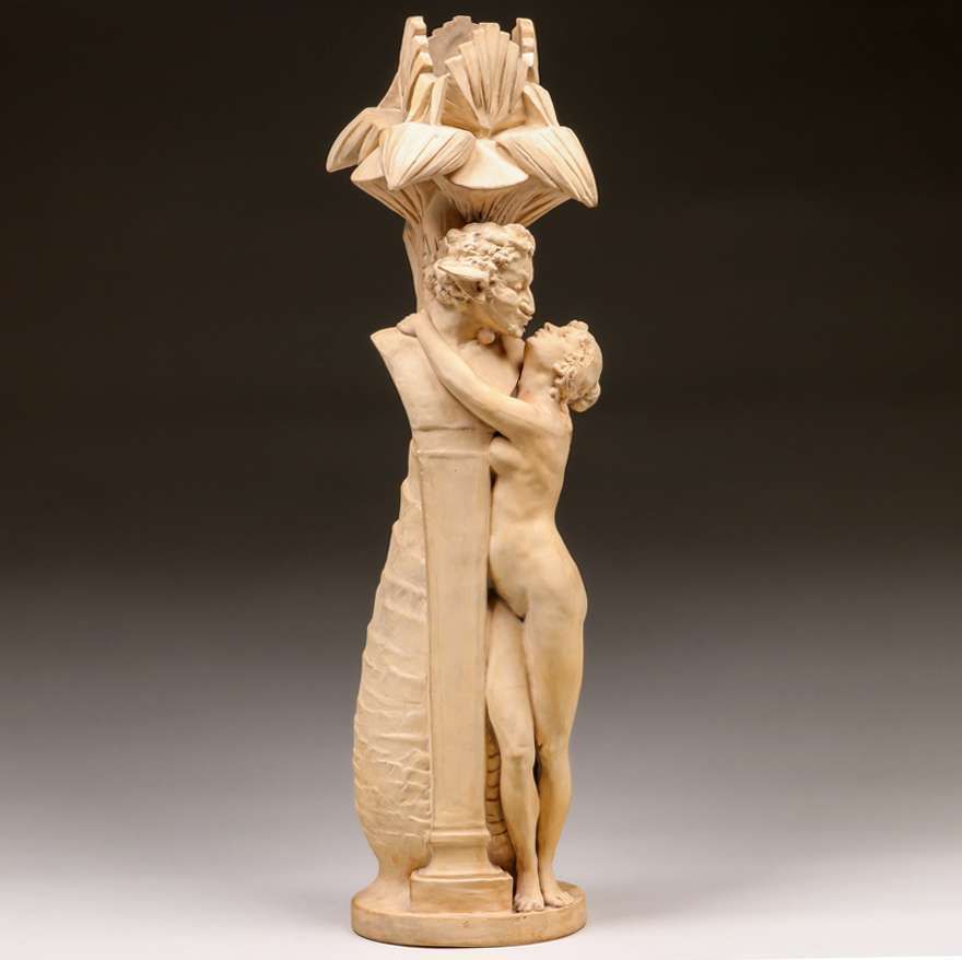 Large Teco Pottery Bisque Vase Satyr & Nymph c1905. Signed. Invisible professional restoration to small base chip, otherwise perfect condition. 25"h x 7"d SOLD